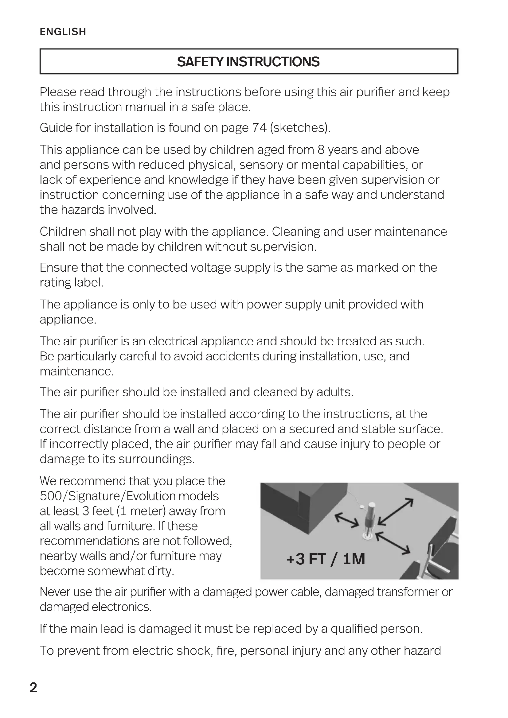 LAIFST LAIFST-001 LAIFEV LAIFEV-050502 LAIFSU22 SAFETY INSTRUCTIONS Please read through the instructions before using this air purier and keep this instruction manual in a safe place. Guide for installation is found on page 74 (sketches). This appliance can be used by children aged from 8 years and above and persons with reduced physical, sensory or mental capabilities, or lack of experience and knowledge if they have been given supervision or instruction concerning use of the appliance in a safe way and understand the hazards involved. Children shall not play with the appliance. Cleaning and user maintenance shall not be made by children without supervision. Ensure that the connected voltage supply is the same as marked on the rating label. The appliance is only to be used with power supply unit provided with appliance. The air purier is an electrical appliance and should be treated as such. Be particularly careful to avoid accidents during installation, use, and maintenance. The air purier should be installed and cleaned by adults. The air purier should be installed according to the instructions, at the correct distance from a wall and placed on a secured and stable surface. If incorrectly placed, the air purier may fall and cause injury to people or damage to its surroundings. We recommend that you place the 500/Signature/Evolution models at least 3 feet (1 meter) away from all walls and furniture. If these recommendations are not followed, nearby walls and/or furniture may become somewhat dirty. Never use the air purier with a damaged power cable, damaged transformer or damaged electronics. If the main lead is damaged it must be replaced by a qualied person. To prevent from electric shock, re, personal injury and any other hazard ENGLISH +3 FT / 1M3 do not immerse the air purier including the transformer into water or any other liquid. Do not place the air purier or cable near a heat source. Do not use the air purier outdoors. Do not use the air purier in damp rooms. Do not use the air purier in conjunction with coloured or oil-based candles, as they emit soot which can become attached to walls and furniture. You may experience a small electric discharge when touching the collector. This is harmless! If you nd this discharge unpleasant, unplug the appliance before handling it and use the protective guard when the air purier is on. Note that the protective guard is optional and not necessary from a safety perspective. Note: LifeAir cannot be held responsible for any damage caused as a result of failure to follow the recommendations. ENGLISH4 You MUST disconnect the power supply and turn off the air purier before cleaning. Do NOT wash the collector in the dish- washer. Do NOT use cleaning products that contain alcohol solutions, ammonia, or alkaline substances, as these products may damage the air purier. The collector should be cleaned approx. once every two weeks or when needed. The collector may require more frequent clean- ing if used in highly contaminated environ- ments. Cleaning the collector: