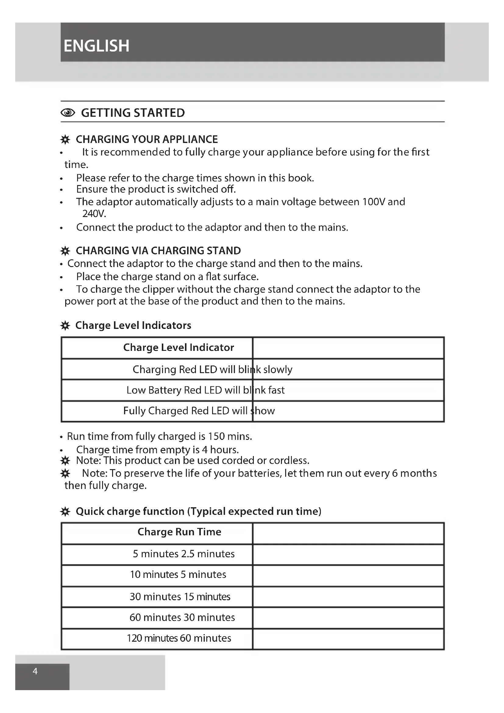 - It is recommended to fully charge your appliance before using for the first time.
