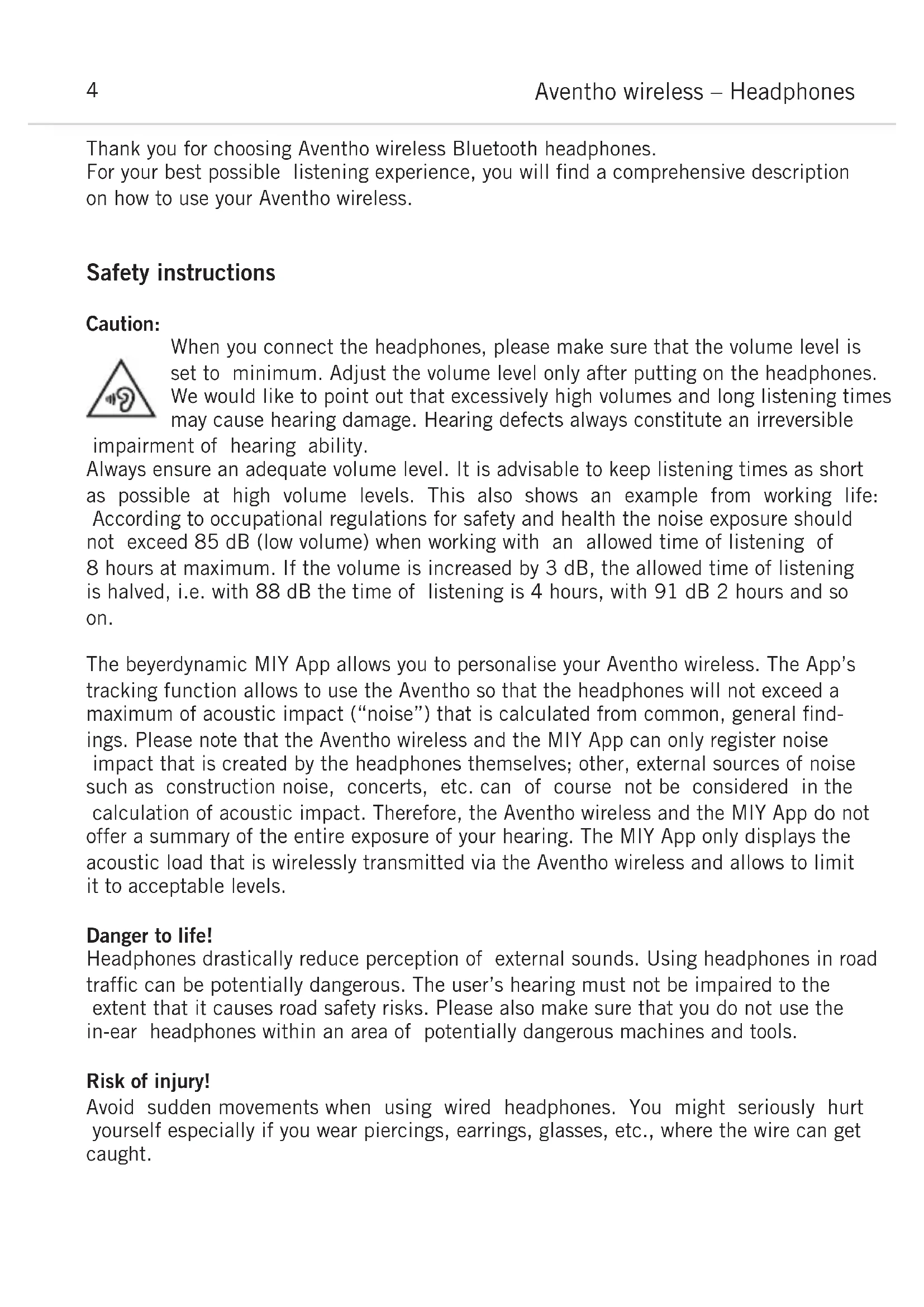 - 中文 Thank you for choosing Aventho wireless Bluetooth headphones. For your best possible listening experience, you will find a comprehensive description on how to use your Aventho wireless. Safety instructions Caution: When you connect the headphones, please make sure that the volume level is set to minimum. Adjust the volume level only after putting on the headphones. We would like to point out that excessively high volumes and long listening times may cause hearing damage. Hearing defects always constitute an irreversible impairment of hearing ability. Always ensure an adequate volume level. It is advisable to keep listening times as short as possible at high volume levels. This also shows an example from working life: According to occupational regulations for safety and health the noise exposure should not exceed 85 dB (low volume) when working with an allowed time of listening of 8 hours at maximum. If the volume is increased by 3 dB, the allowed time of listening is halved, i.e. with 88 dB the time of listening is 4 hours, with 91 dB 2 hours and so on. The beyerdynamic MIY App allows you to personalise your Aventho wireless. The App’s tracking function allows to use the Aventho so that the headphones will not exceed a maximum of acoustic impact (“noise”) that is calculated from common, general find- ings. Please note that the Aventho wireless and the MIY App can only register noise impact that is created by the headphones themselves; other, external sources of noise such as construction noise, concerts, etc. can of course not be considered in the calculation of acoustic impact. Therefore, the Aventho wireless and the MIY App do not offer a summary of the entire exposure of your hearing. The MIY App only displays the acoustic load that is wirelessly transmitted via the Aventho wireless and allows to limit it to acceptable levels. Danger to life! Headphones drastically reduce perception of external sounds. Using headphones in road traffic can be potentially dangerous. The user’s hearing must not be impaired to the extent that it causes road safety risks. Please also make sure that you do not use the in-ear headphones within an area of potentially dangerous machines and tools. Risk of injury! Avoid sudden movements when using wired headphones. You might seriously hurt yourself especially if you wear piercings, earrings, glasses, etc., where the wire can get caught. Aventho wireless – Headphones 4english Aventho wireless – Headphones p. 132