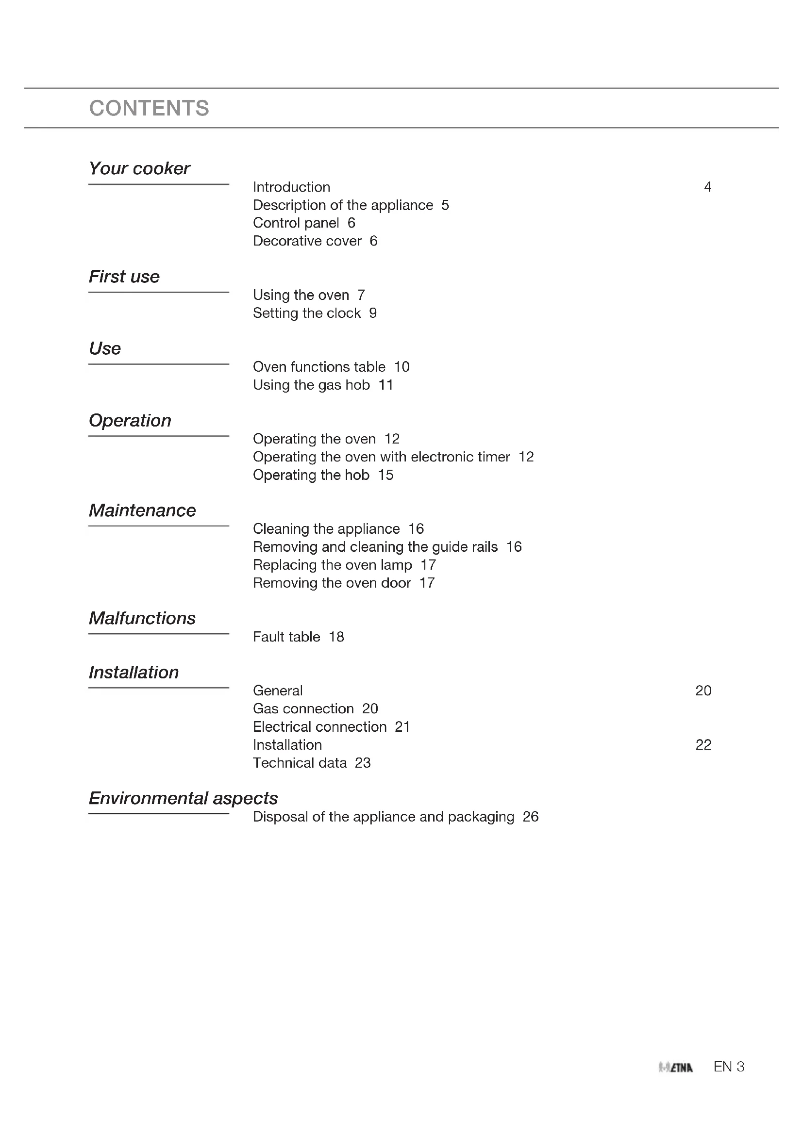 If the door does not open or close properly, make sure the hinge notches are positioned correctly in the hinge holders. MAINTENANCEEN 18 Fault table If you are uncertain about whether your appliance is functioning properly, this does not automatically mean there is a defect. Make sure to check the points mentioned below in the table first, or visit our website ‘www.Etna.nl’ for more information. Problems with the hob Possible cause Solution There is a smell of gas in the vicinity of the appliance. The appliance connection is leaking. Turn off the main gas tap. Contact your installer. A burner does not ignite. Plug not in socket. Insert the plug into the wall socket. Fuse defective/fuse in meter cabinet switched off. Replace the fuse or switch on the fuse in the fuse box. Spark plug dirty/damp. Clean/dry the spark plug. Burner parts not correctly installed. Assemble the burner parts using the centring ridges. Burner parts dirty/damp. Clean/dry the burner components. Make sure that the outflow holes are open. Main gas supply valve closed. Open the main gas valve. Fault in gas mains. Consult you gas supplier. Gas bottle or tank is empty. Connect a new gas bottle or have the tank refilled. Wrong type of gas used. Check whether the gas used is suitable for the appliance. Contact your installer if it is not correct. Control knob not pressed in far enough. Keep the control knob pressed in far enough between full and low. This can take longer the first time because of the gas supply. The burner does not burn evenly. Burner parts not placed correctly. Assemble the burner parts using the centring ridges. Burner parts dirty/damp. Clean/dry the burner parts. Make sure that the outflow holes are open. Wrong type of gas used. Check whether the gas used is suitable for the appliance. Contact your installer if it is not correct. MALFUNCTIONSEN 19 MALFUNCTIONS Problems with the hob Possible cause Solution The burner goes out after igniting. Control knob not pressed in long enough. Keep the control knob pressed in for at least 10 seconds. Problems with the oven Possible cause Solution The oven light does not work. The oven light is defect. Replace the oven light. The oven does not heat up. No temperature set. Set the temperature using the temperature knob. Electronic timer active. Set the electronic timer to ‘0:00’. A visit by a service technician during the warranty period will be charged if the appliance is not functioning because of improper use!EN 20 INSTALLATION General A registered installer should only connect this appliance. The gas connection and the electrical connection must comply with national and local regulations. Read the separate safety instructions first! Note!