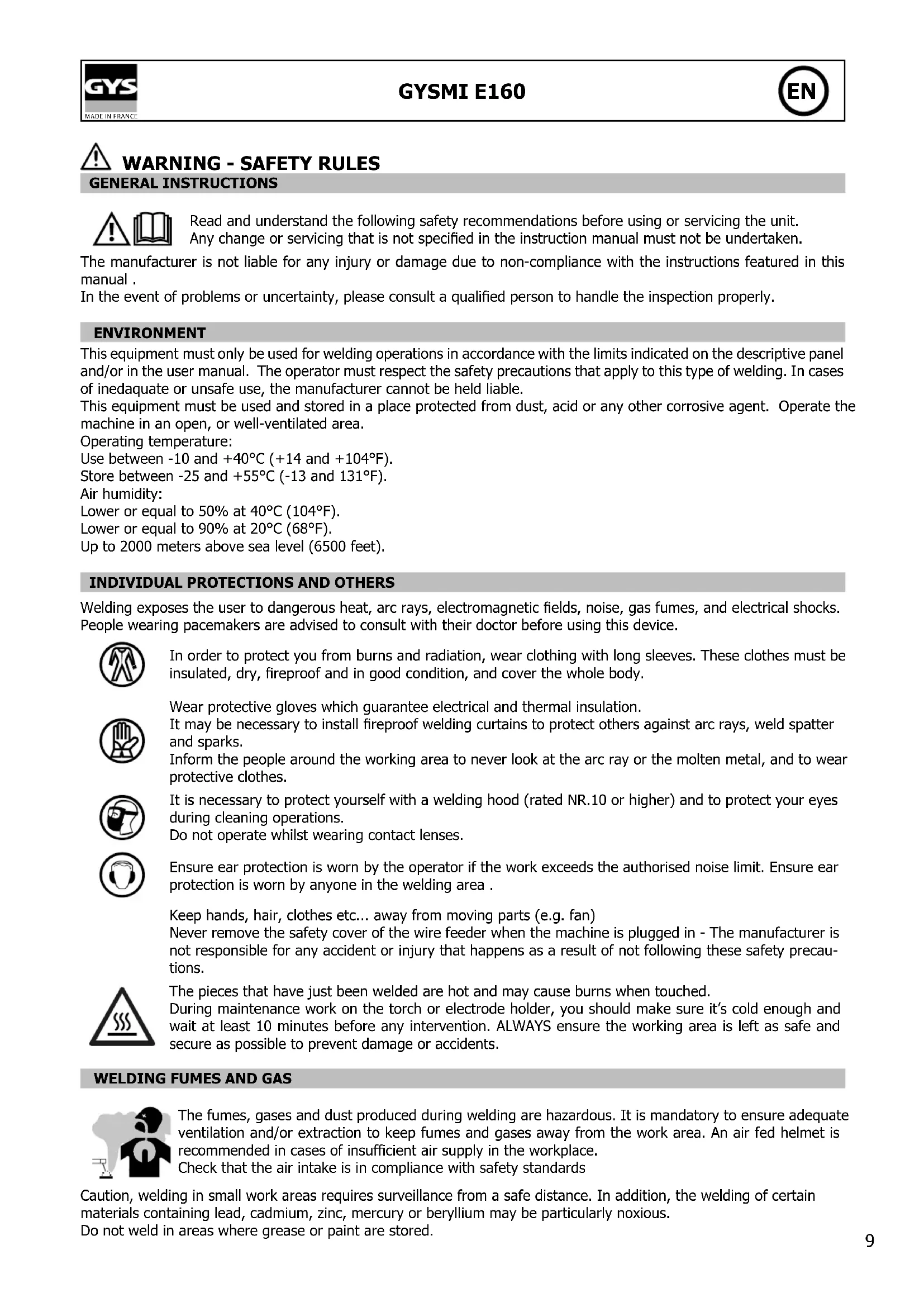 The fumes, gases and dust produced during welding are hazardous. It is mandatory to ensure adequate ventilation and/or extraction to keep fumes and gases away from the work area. An air fed helmet is recommended in cases of insufcient air supply in the workplace. Check that the air intake is in compliance with safety standards Caution, welding in small work areas requires surveillance from a safe distance. In addition, the welding of certain materials containing lead, cadmium, zinc, mercury or beryllium may be particularly noxious. Do not weld in areas where grease or paint are stored.10 GYSMI E160