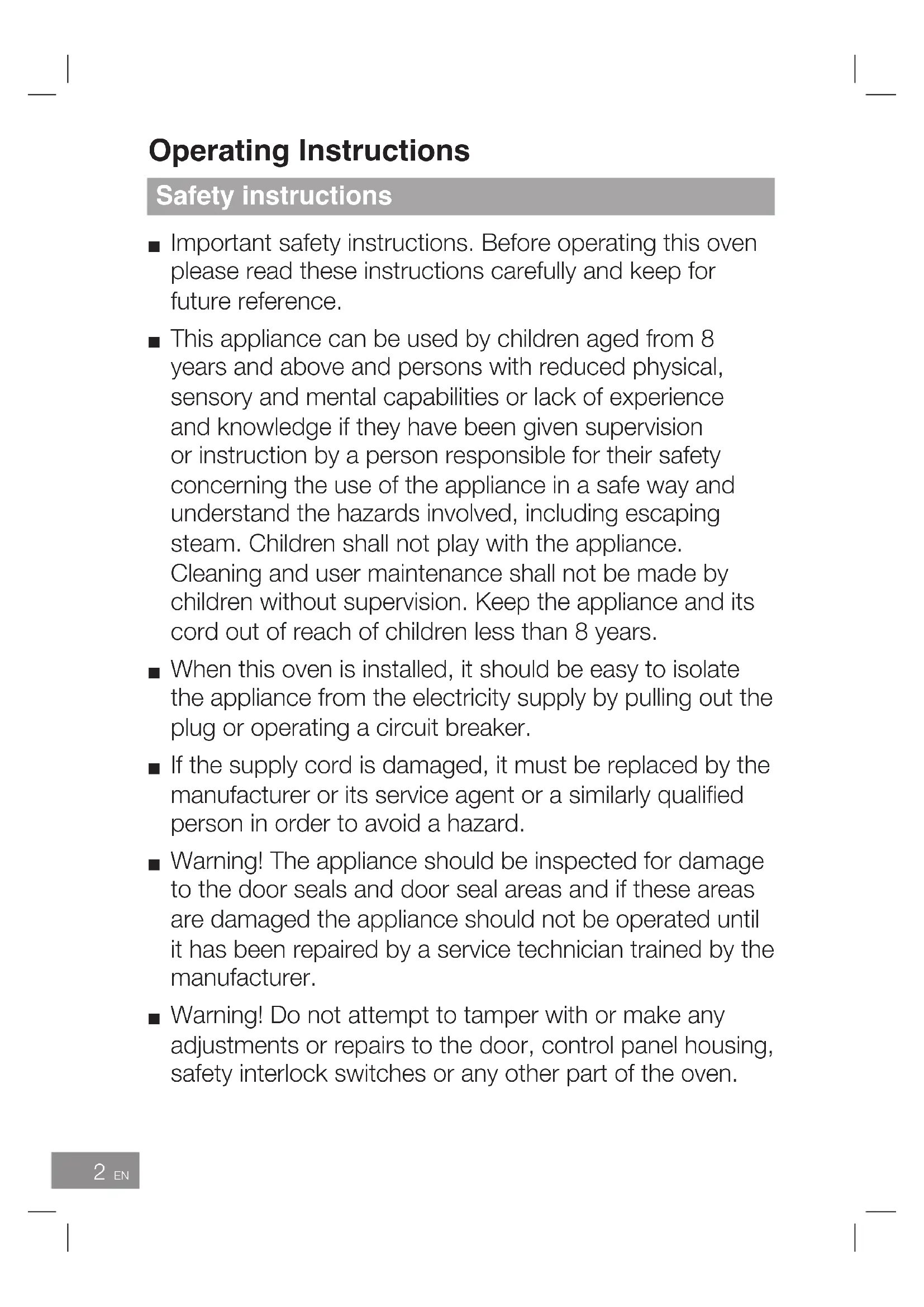 aged from 8 years and above and persons with reduced physical, sensory and mental capabilities or lack of experience and knowledge if they have been given supervision or instruction by a person responsible for their safety concerning the use of the appliance in a safe way and understand the hazards involved, including escaping steam. Children shall not play with the appliance. Cleaning and user maintenance shall not be made by children without supervision. Keep the appliance and its cord out of reach of children less than 8 years. Read carefully and keep for future reference. Important safety instructions11 EN English Use of your oven