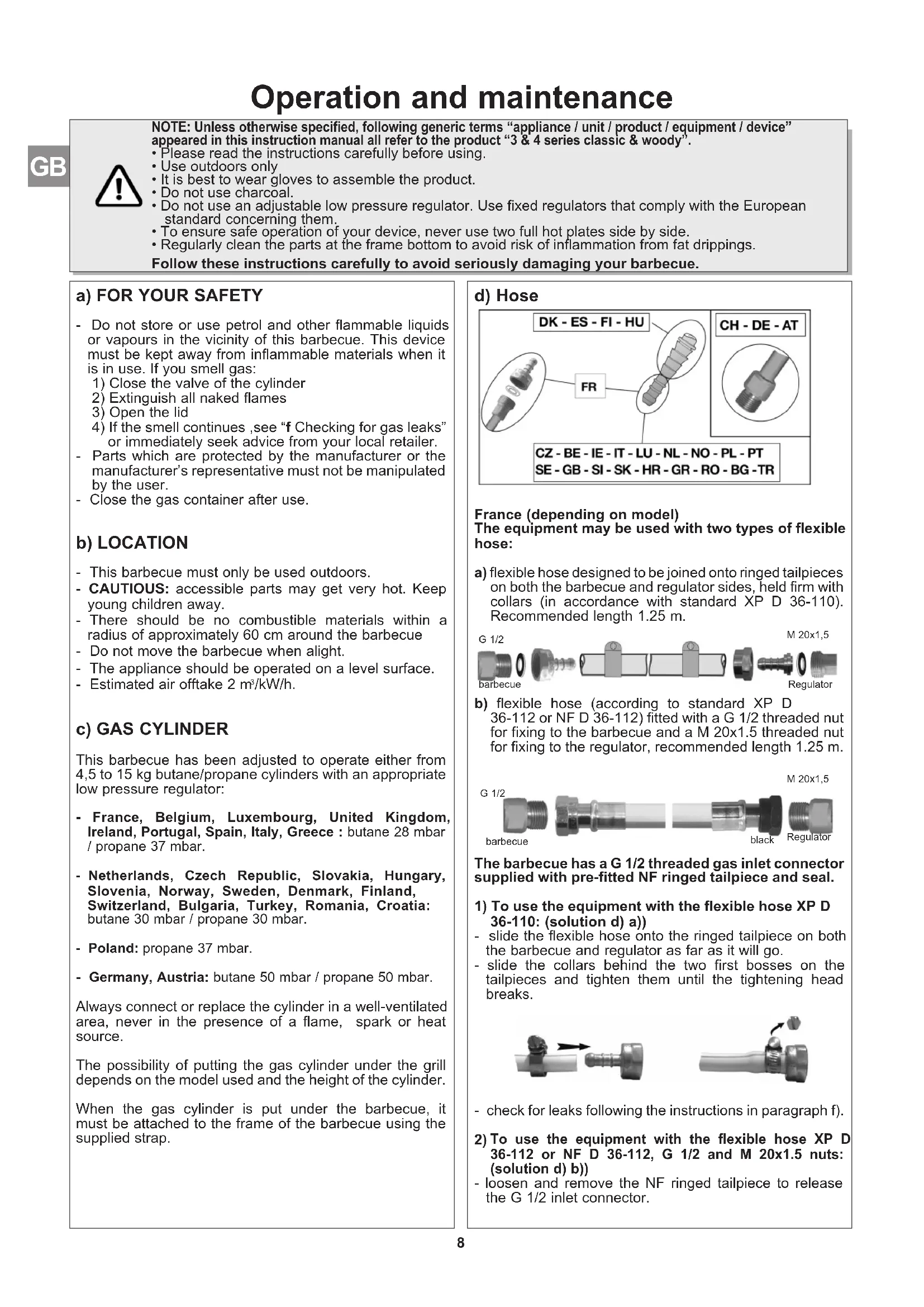 /kW/h. c) GAS CYLINDER This barbecue has been adjusted to operate either from 4,5 to 15 kg butane/propane cylinders with an appropriate low pressure regulator: - France, Belgium, Luxembourg, United Kingdom, Ireland, Portugal, Spain, Italy, Greece : butane 28 mbar / propane 37 mbar. - Netherlands, Czech Republic, Slovakia, Hungary, Slovenia, Norway, Sweden, Denmark, Finland, Switzerland, Bulgaria, Turkey, Romania, Croatia: butane 30 mbar / propane 30 mbar. - Poland: propane 37 mbar. - Germany, Austria: butane 50 mbar / propane 50 mbar. Alwaysconnectorreplacethecylinderinawell-ventilated area, never in the presence of a flame, spark or heat source. The possibility of putting the gas cylinder under the grill depends on the model used and the height of the cylinder. When the gas cylinder is put under the barbecue, it must be attached to the frame of the barbecue using the supplied strap. d) Hose France (depending on model) The equipment may be used with two types of flexible hose: a) flexible hose designed to be joined onto ringed tailpieces on both the barbecue and regulator sides, held firm with collars (in accordance with standard XP D 36-110). Recommended length 1.25 m. b) flexible hose (according to standard XP D 36-112 or NF D 36-112) fitted with a G 1/2 threaded nut for fixing to the barbecue and a M 20x1.5 threaded nut for fixing to the regulator, recommended length 1.25 m. The barbecue has a G 1/2 threaded gas inlet connector supplied with pre-fitted NF ringed tailpiece and seal.