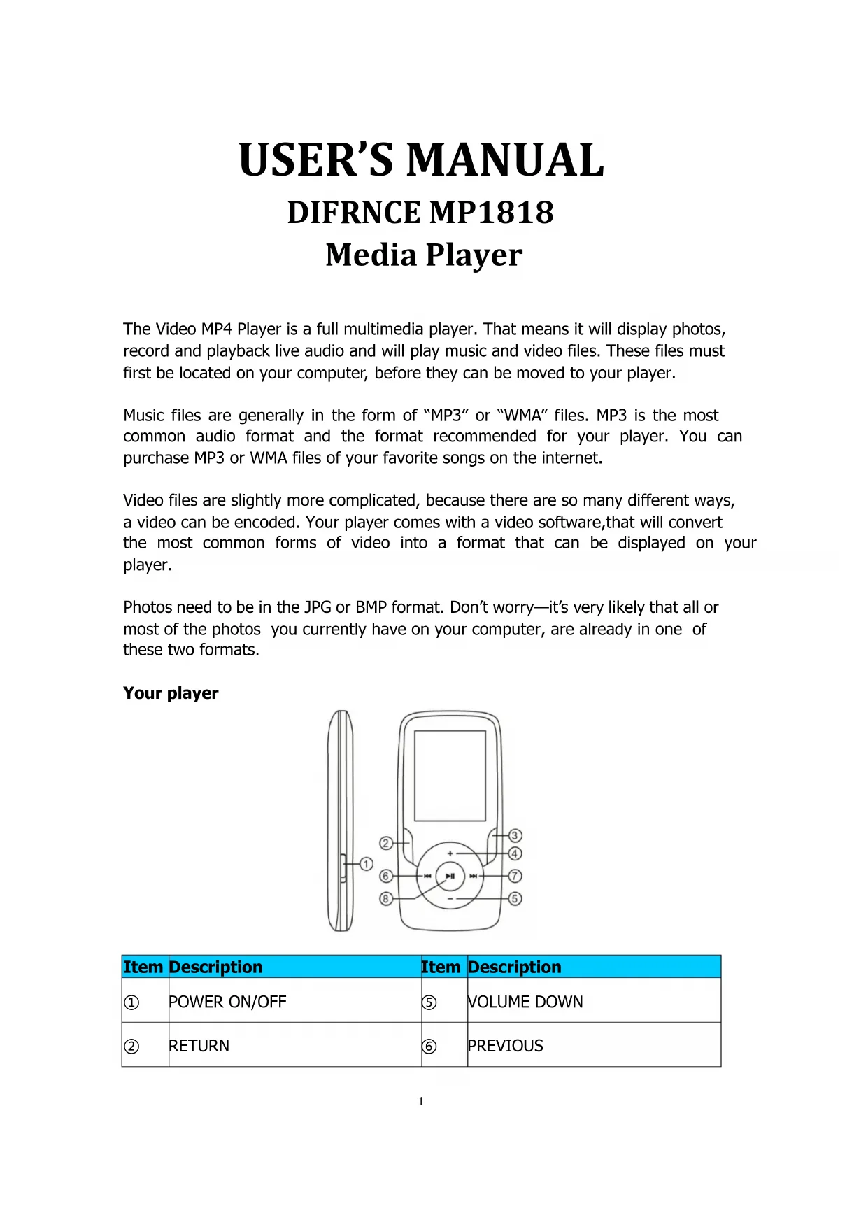 USER'S MANUAL DIFRNCE MP1818 Media Player