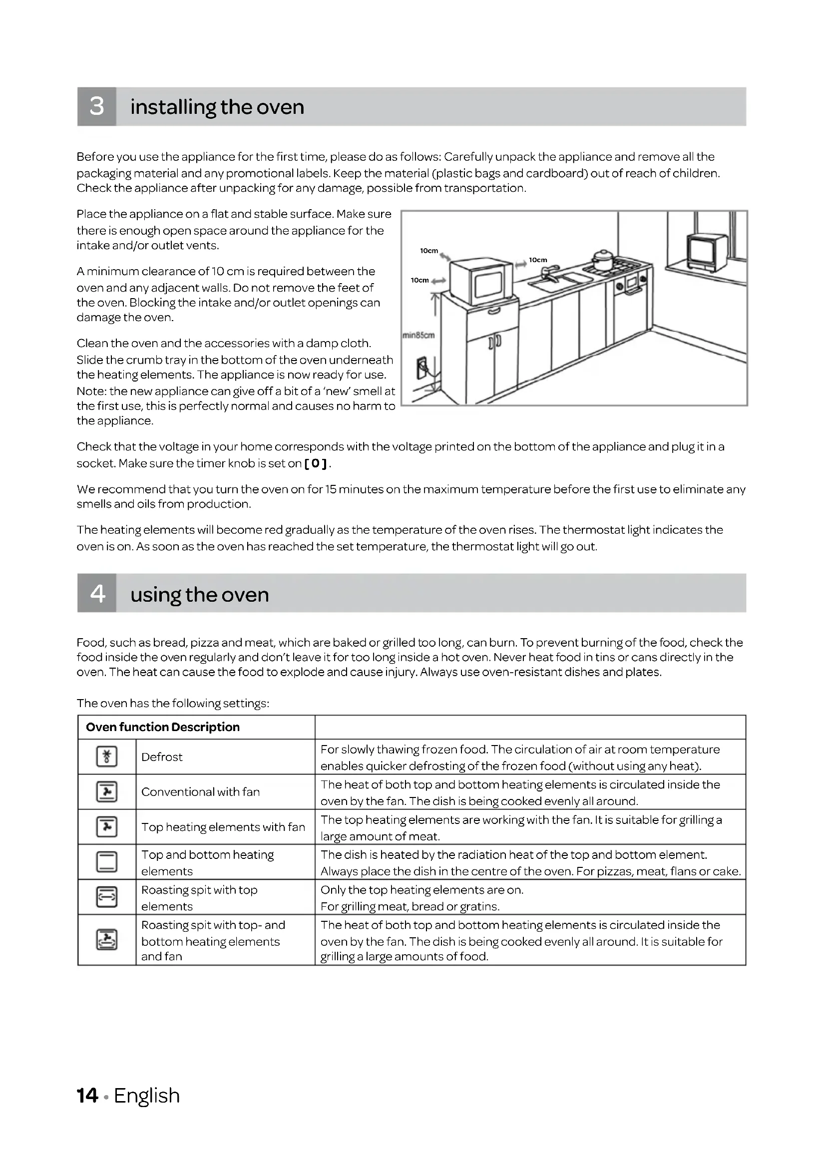 - To guarantee a good circulation of the air keep a minimum clearance of 10cm between the oven and any adjacent walls.