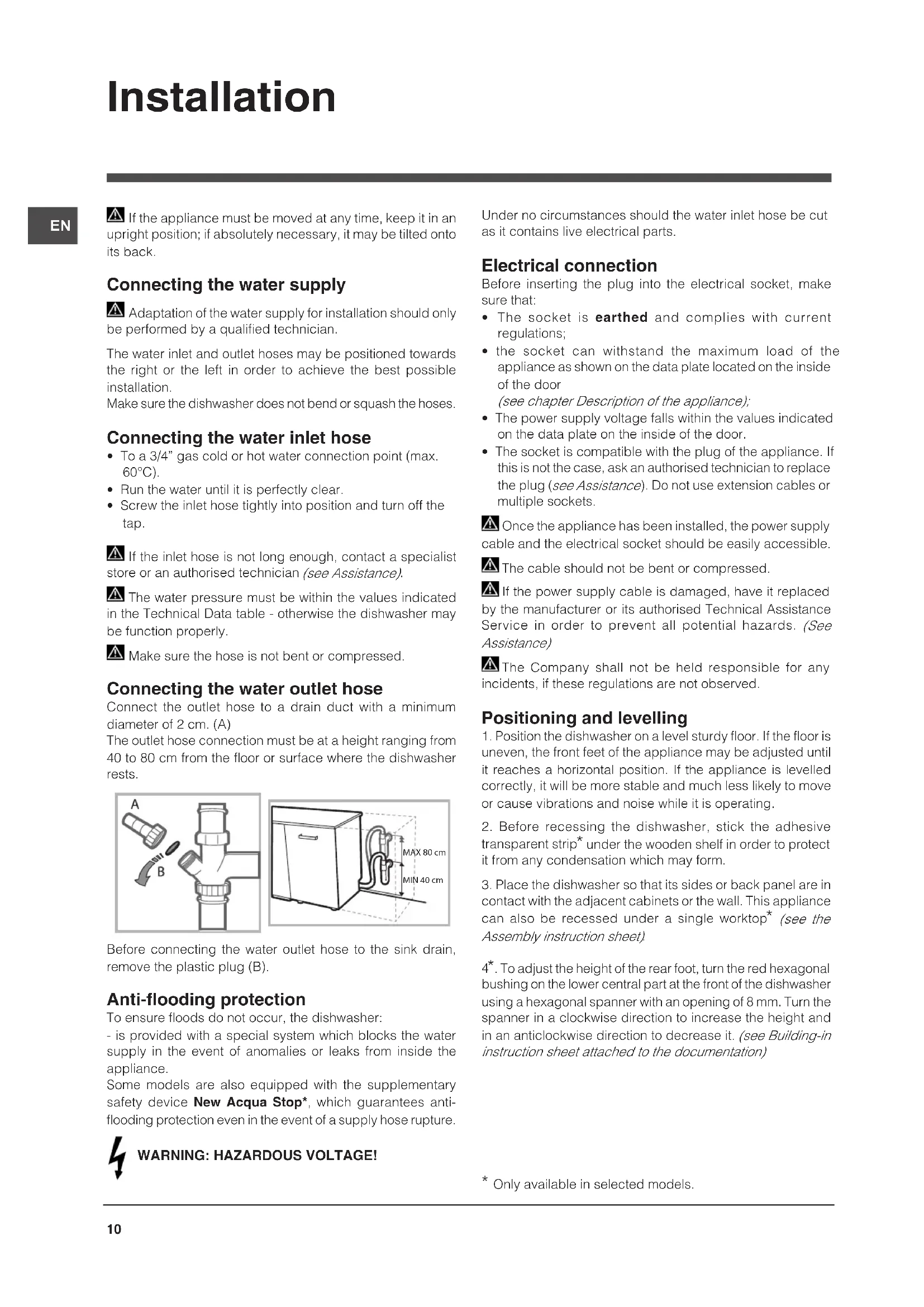 The water pressure must be within the values indicated in the Technical Data table - otherwise the dishwasher may be function properly.Make sure the hose is not bent or compressed. Connecting the water outlet hose Connect the outlet hose to a drain duct with a minimum diameter of 2 cm. (A)The outlet hose connection must be at a height ranging from 40 to 80 cm from the floor or surface where the dishwasher rests.Before connecting the water outlet hose to the sink drain, remove the plastic plug (B). Anti-flooding protection To ensure floods do not occur, the dishwasher:- is provided with a special system which blocks the water supply in the event of anomalies or leaks from inside the appliance.Some models are also equipped with the supplementary safety device New Acqua Stop*, which guarantees anti-flooding protection even in the event of a supply hose rupture.