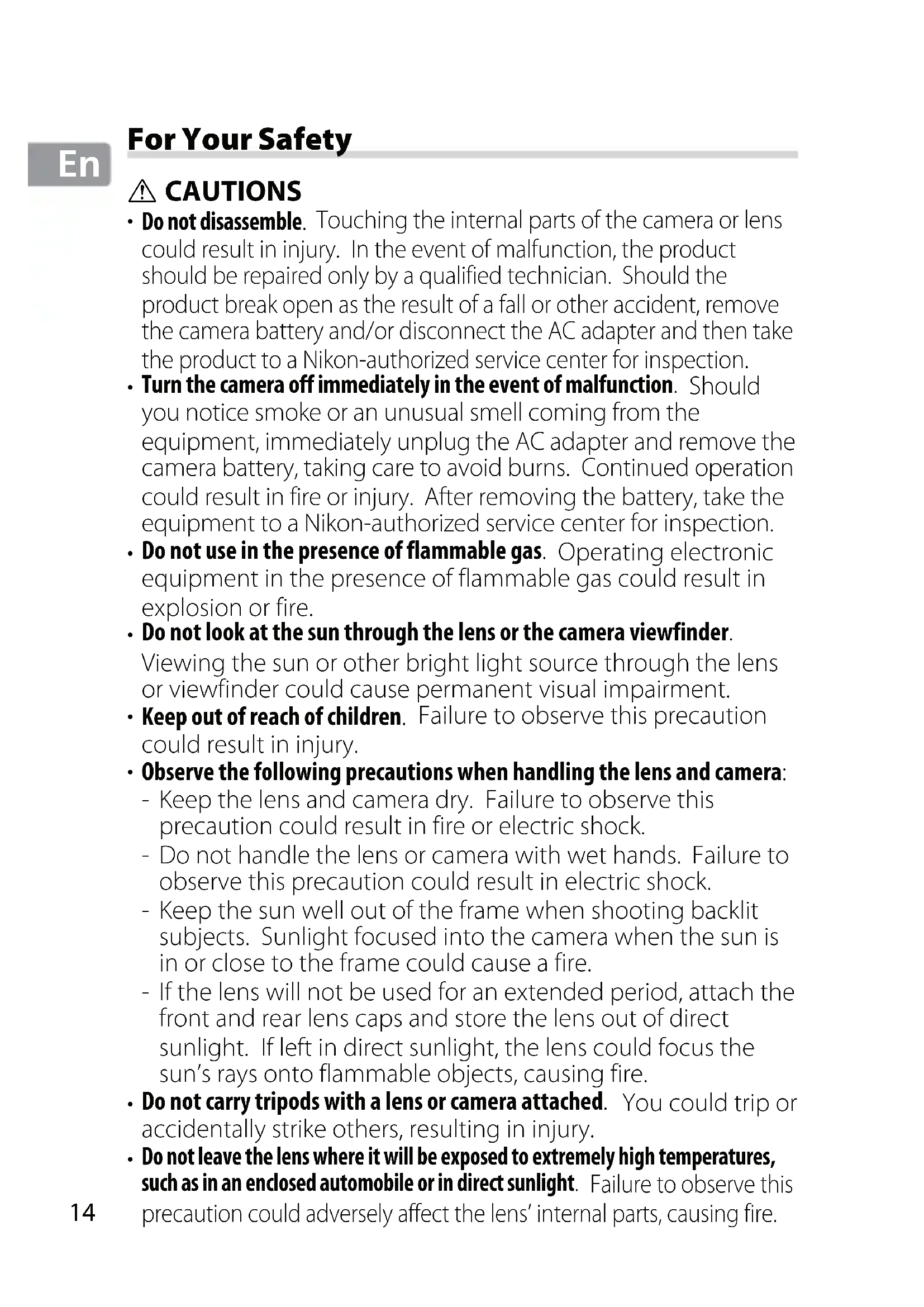For Your Safety CAUTIONS Do not disassemble. Touching the internal parts of the camera or lens could result in injury. In the event of malfunction, the product should be repaired only by a qualified technician. Should the product break open as the result of a fall or other accident, remove the camera battery and/or disconnect the AC adapter and then take the product to a Nikon-authorized service center for inspection. Turn the camera off immediately in the event of malfunction. Should you notice smoke or an unusual smell coming from the equipment, immediately unplug the AC adapter and remove the camera battery, taking care to avoid burns. Continued operation could result in fire or injury. After removing the battery, take the equipment to a Nikon-authorized service center for inspection. Do not use in the presence of flammable gas. Operating electronic equipment in the presence of flammable gas could result in explosion or fire. Do not look at the sun through the lens or the camera viewfinder. Viewing the sun or other bright light source through the lens or viewfinder could cause permanent visual impairment. Keep out of reach of children. Failure to observe this precaution could result in injury. Observe the following precautions when handling the lens and camera: Keep the lens and camera dry. Failure to observe this precaution could result in fire or electric shock. Do not handle the lens or camera with wet hands. Failure to observe this precaution could result in electric shock. Keep the sun well out of the frame when shooting backlit subjects. Sunlight focused into the camera when the sun is in or close to the frame could cause a fire. If the lens will not be used for an extended period, attach the front and rear lens caps and store the lens out of direct sunlight. If left in direct sunlight, the lens could focus the sun’s rays onto flammable objects, causing fire. Do not carry tripods with a lens or camera attached. You could trip or accidentally strike others, resulting in injury. Do not leave the lens where it will be exposed to extremely high temperatures, such as in an enclosed automobile or in direct sunlight. Failure to observe this precaution could adversely affect the lens’ internal parts, causing fire.