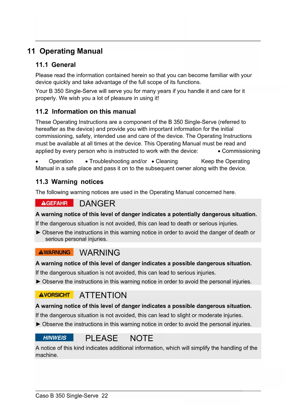 The rating plate with the connection and performance data can be found beneath the device.Caso B 350 Single-Serve 28 14 Operation and Handing This chapter provides you with important notices with regard to operating the device. Observe the following notices to avoid dangers and damages: Warning ► Do not leave the device unsupervised when it is in operation, so that you can intervene quickly in the event of dangers.