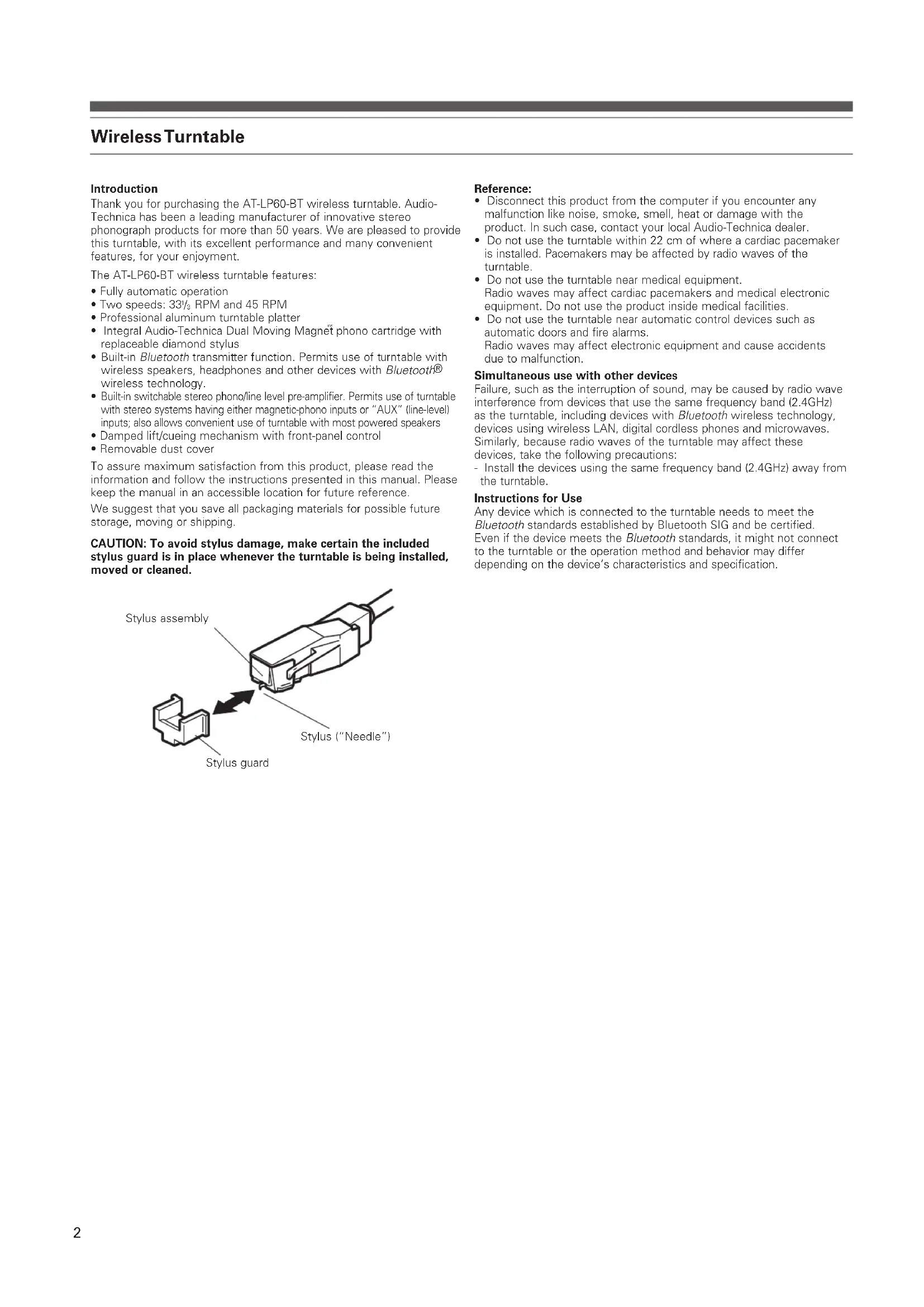 cut the connection to the Bluetooth receiver device. Indicator will turn off. About Indicator Display The wireless function button’s Indicator LED displays the following wireless operating status by flashing or turning on: Operating status Searching for device Pairing Connect Waiting to be connected LED display patterns FlashingLitConnectingBlueRed Figure 4 Stylus assembly Stylus (“Needle”) Stylus guard Figure 5 45 RPM adapter7 English Operation (continued) Replacing the Stylus While holding the head of the tone arm, rotate the front of the stylus assembly in a forward and down motion to remove it (Fig. 9). (As you remove the old assembly, note its position and “feel,” to aid in properly installing the new one.) Install the new stylus assembly as shown in Figures 10a/10b, being careful not to touch the actual stylus. Make certain that the projection at the back of the assembly is fully seated in the cartridge body first (Fig. 10a), and that the assembly “clicks” up into place, with no gap between its top edge and the front of the black plastic tone arm head (Fig. 10b). Replace the stylus after 400 hours of use. To maintain original performance, insist upon a genuine Audio-Technica brand replacement stylus. Look for the Audio-Technica trademark ( ) on the front of the stylus assembly and on the packaging. (Out) Figure 6 Figure 7 (In) Figure 8 8a 8b 8c Figure 10 – Installing a new stylus 10a 10b Caution: When the tone arm reaches the end of the record, it will lift and return to the tone arm rest automatically. When this happens, do not interfere with the tone arm’s motion, or damage to the mechanism may occur. If the tone arm does not return automatically to the tone arm rest after the record has finished playing, simply press the STOP button to complete operation. Manual Operation