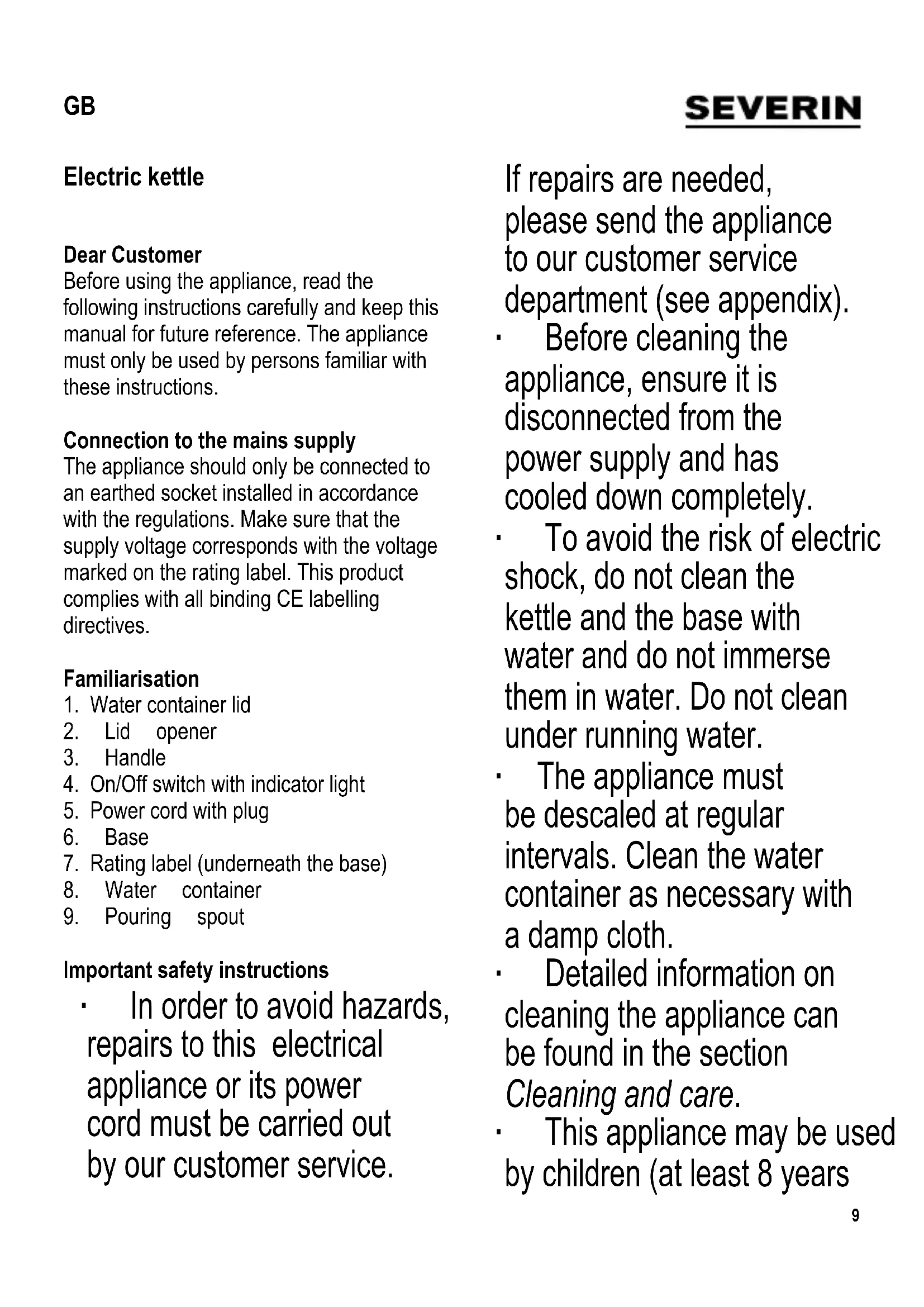 Important safety instructions ∙ In order to avoid hazards, repairs to this electrical appliance or its power cord must be carried out by our customer service. If repairs are needed, please send the appliance to our customer service department (see appendix). ∙ Before cleaning the appliance, ensure it is disconnected from the power supply and has cooled down completely. ∙ To avoid the risk of electric shock, do not clean the kettle and the base with water and do not immerse them in water. Do not clean under running water. ∙ The appliance must be descaled at regular intervals. Clean the water container as necessary with a damp cloth. ∙ Detailed information on cleaning the appliance can be found in the section Cleaning and care. ∙ This appliance may be used by children (at least 8 years GB10 of age) and by persons with reduced physical, sensory or mental capabilities, or lacking experience and knowledge, provided they have been given supervision or instruction concerning the use of the appliance and fully understand all dangers and safety precautions involved. ∙ Children must not be permitted to play with the appliance. ∙ Children must not be permitted to carry out any cleaning or maintenance work on the appliance unless they are supervised and at least 8 years of age. ∙ The appliance and its power cord must be kept well away from children under 8 at all times. ∙ This appliance is intended for domestic or similar applications, such as the - staff kitchens in shops, offi ces and other similar working environments, - agricultural working environments, - by customers in hotels, motels etc. and similar accommodation, - in bed-and breakfast type environments. ∙ The exterior surfaces become hot during use and will remain so for some time afterwards. ∙ Do not leave the water kettle unattended during operation. Use only pure water when fi lling the container to the desired level, observing the Min. (0.5 l) and Max. (1.7 l) markings. Overfi lling the container may cause danger from boiling water being forced out.11 ∙ Also beware of the danger of scalding from hot steam being emitted. Therefore, do not touch any parts of the appliance except the handle during use. ∙ Caution! During the boiling process and when pouring out hot water, the lid must be kept closed at all times. ∙ The kettle may only be operated with the base provided with the appliance. ∙ Never remove the water container from the base (or replace it) while the appliance is switched on. ∙ The electrical connections in the base must be protected at all times against possible contact with water. ∙ Caution: Any misuse of the appliance can cause severe personal injury. ∙ Caution: Keep any packaging materials well away from children – such materials are a potential source of danger, e.g. of suffocation. ∙ Every time the appliance is used, the main body including the power cord as well as any attachment fi tted should be checked thoroughly for any defects. Should the appliance, for instance, have been dropped onto a hard surface, or if excessive force has been used to pull the power cord, it must no longer be used: even invisible damage may have adverse effects on the operational safety of the appliance. ∙ Caution: To prevent the glass from cracking, do not fi ll the hot container with cold water. ∙ Because of the kettle’s high power usage, it must not be operated with any type of extension cable. ∙ The appliance must be used only on a heat-resistant, level surface. ∙ Do not operate the appliance below a hanging cupboard or similar object; there is a risk that escaping steam may be trapped underneath. ∙ Do not allow the appliance or its power cord to come into contact with open fl ames or any hot surfaces such as hot- plates. ∙ Do not let the power cord hang free, and keep the cord well away from hot parts of the housing. ∙ Always remove the plug from the wall socket, - in case of any malfunction, - after use, - during cleaning. ∙ No responsibility is accepted if damage results from improper use, or if these instructions are not complied with.12 Thermal safety cut-out The pre-set thermal safety cut-out protects the heating element from overheating should the appliance be erroneously switched on without any water, or if the heating plate is calcifi ed. Once the safety cut-out has switched off the kettle, it must be allowed to cool down suffi ciently, or must be descaled before it is switched on again. Before using for the fi rst time To clean the kettle, boil and discard the fi rst fi lling of water. Boiling water ∙ Remove the water container from its base. ∙ Press the lid opener to open the lid. ∙ Fill the container with water to the desired level, observing the Min (0.5 l) and Max (1.7 l) markings. ∙ Close the lid and place the container back on its base. ∙ Insert the plug into a suitable wall socket and press the On/Off switch; the indicator light comes on. ∙ The boiling process begins. After reaching the boiling point, the appliance is automatically switched off by the integral steam cut-off device; the indicator light goes out. ∙ To interrupt the boiling process, set the On/Off switch to its Off position. ∙ To pour hot water, remove the container from its base. ∙ To prevent hot steam from being emitted, ensure that the lid remains closed while pouring out the water. ∙ Remove the plug from the wall outlet after use. ∙ Do not leave any residual water in the container. Power cord wind-up storage The wind-up power cord storage under the base facilitates limiting the length of the power cord during use and makes it easy to store the appliance. Descaling ∙ Depending on the water quality in your area, lime deposits may build up on the heating element. It is advisable to remove any such deposits at regular intervals. ∙ Any warranty claim will be null and void if the appliance malfunctions because of insuffi cient descaling. ∙ A mixture of 0.5 litres of water and