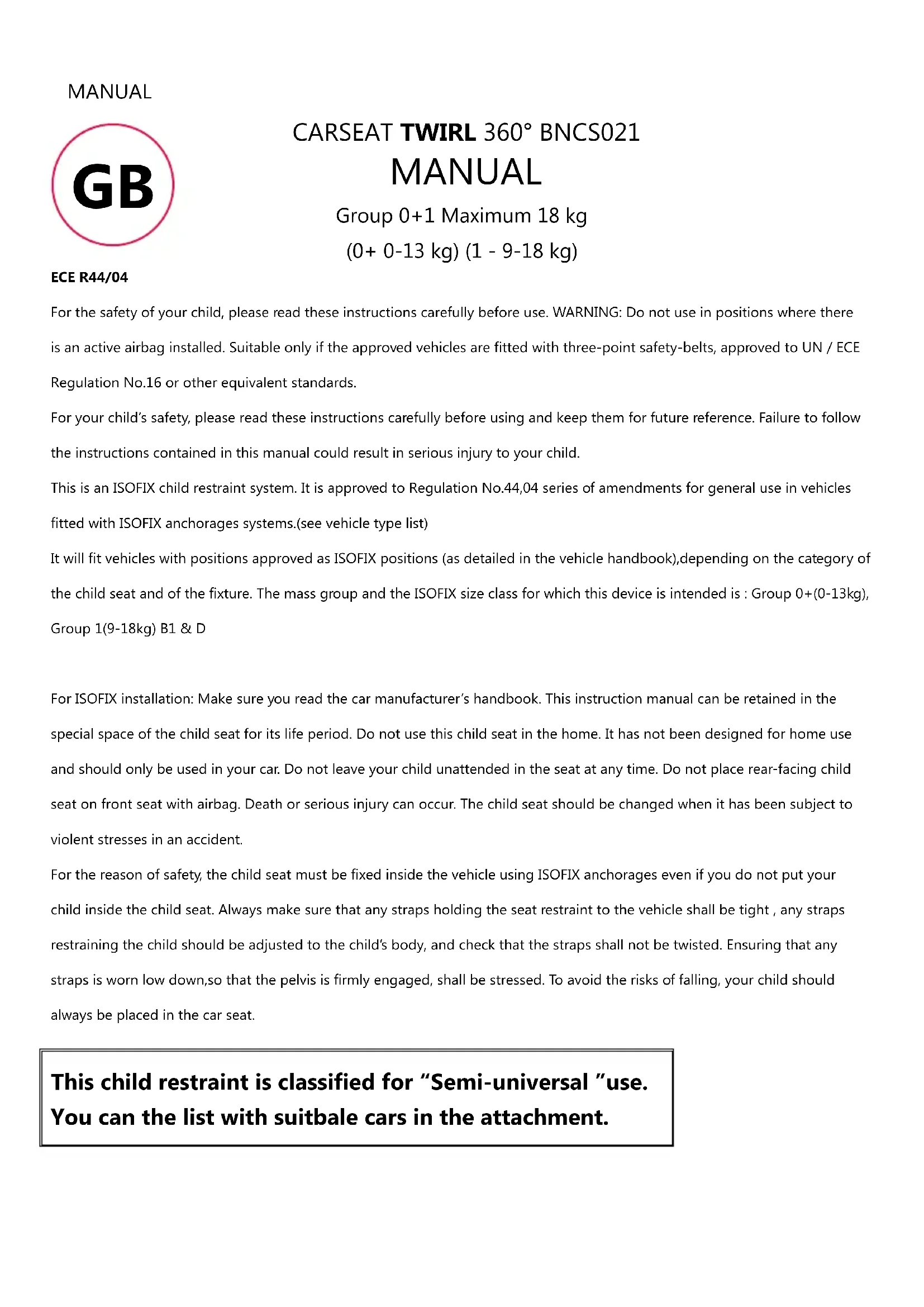 For the safety of your child, please read these instructions carefully before use. WARNING: Do not use in positions where there is an active airbag installed. Suitable only if the approved vehicles are fitted with three-point safety-belts, approved to UN / ECE Regulation No.16 or other equivalent standards.