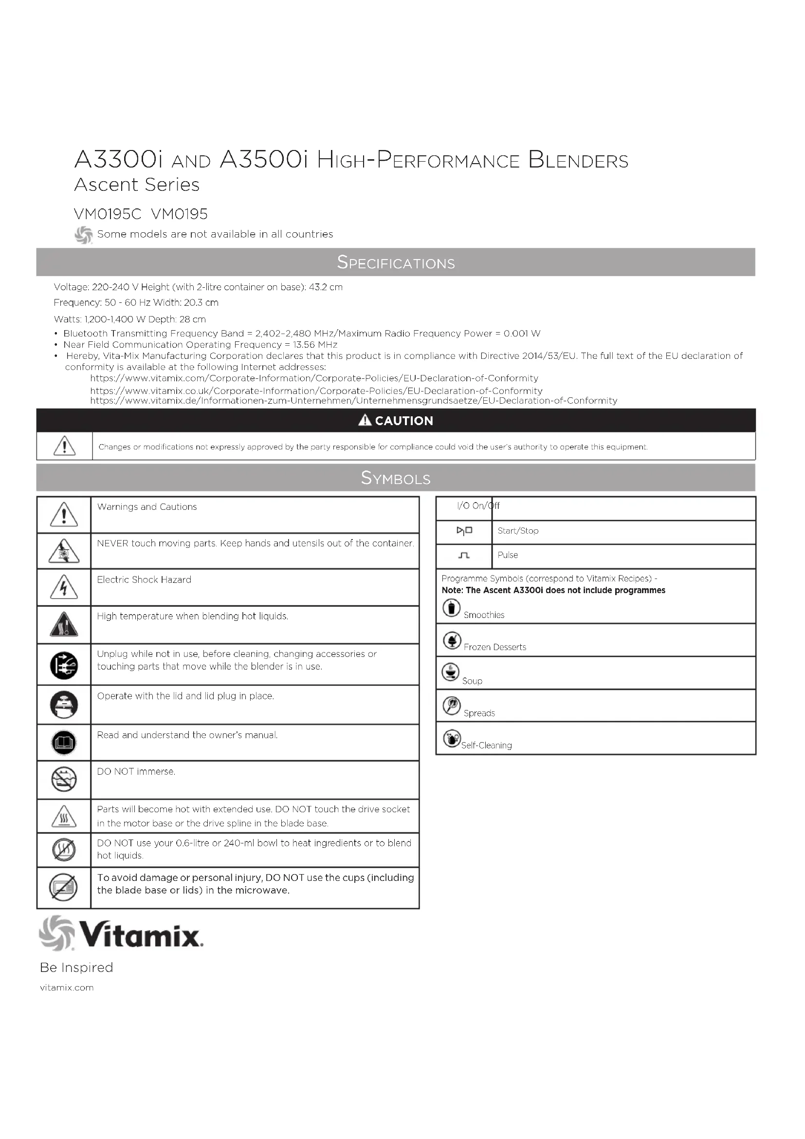 A3300i And A3500i HigH-PerformAnce Blenders Ascent Series Be Inspired vitamix.com VM0185 SymbolS SpecificationS Voltage: 220-240 V Height (with 2-litre container on base): 43.2 cm Frequency: 50 - 60 Hz Width: 20.3 cmWatts: 1,200-1,400 W Depth: 28 cmI/O On/Off Start/StopPulseProgramme Symbols (correspond to Vitamix Recipes) - Note: The Ascent A3300i does not include programmes Smoothies Frozen Desserts Soup SpreadsSelf-Cleaning VM0195C VM0195 Some models are not available in all countries• Bluetooth Transmitting Frequency Band = 2,402–2,480 MHz/Maximum Radio Frequency Power = 0.001 W• Near Field Communication Operating Frequency = 13.56 MHz