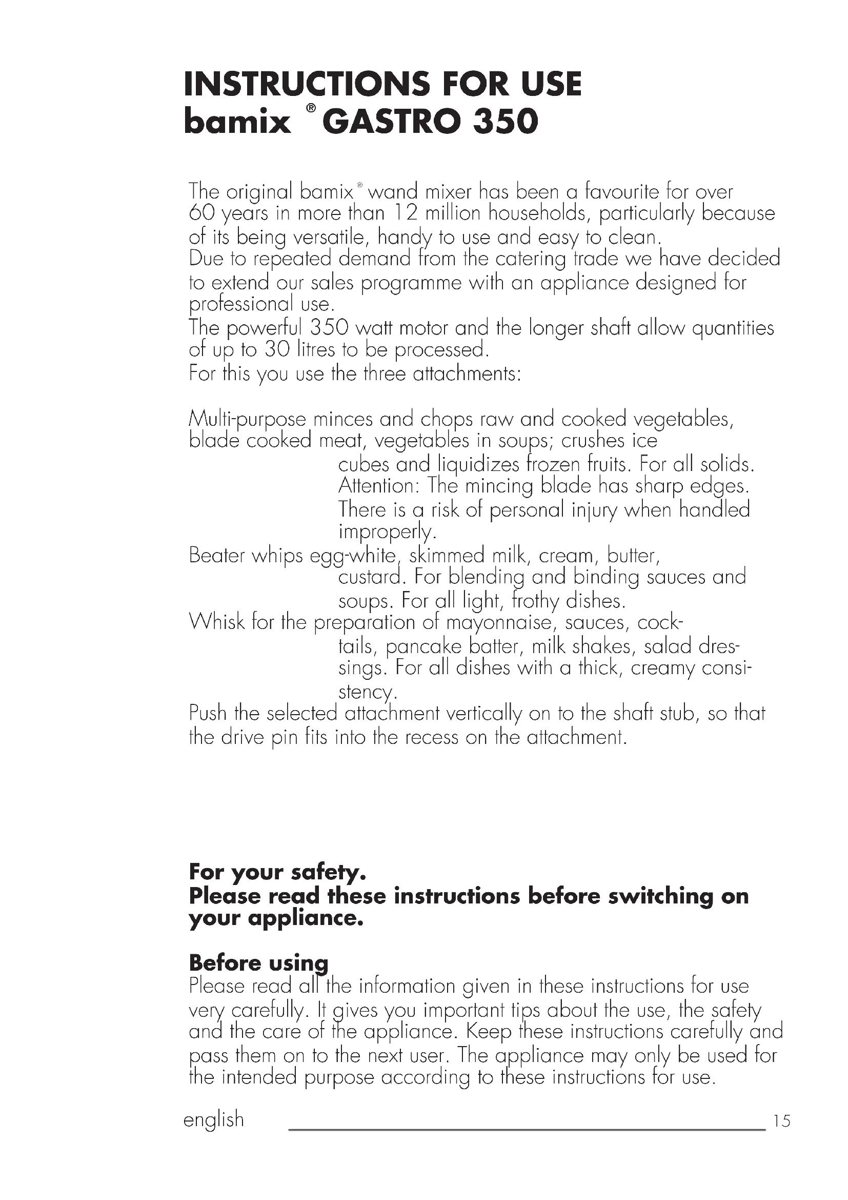 wand mixer has been a favourite for over 60 years in more than 12 million households, particularly because of its being versatile, handy to use and easy to clean. Due to repeated demand from the catering trade we have decided to extend our sales programme with an appliance designed for professional use. The powerful 350 watt motor and the longer shaft allow quantities of up to 30 litres to be processed. For this you use the three attachments: Multi-purpose minces and chops raw and cooked vegetables, blade cooked meat, vegetables in soups; crushes ice cubes and liquidizes frozen fruits. For all solids. Attention: The mincing blade has sharp edges. There is a risk of personal injury when handled improperly. Beater whips egg-white, skimmed milk, cream, butter, custard. For blending and binding sauces and soups. For all light, frothy dishes. Whisk for the preparation of mayonnaise, sauces, cock- tails, pancake batter, milk shakes, salad dres- sings. For all dishes with a thick, creamy consi- stency. Push the selected attachment vertically on to the shaft stub, so that the drive pin fits into the recess on the attachment. For your safety. Please read these instructions before switching on your appliance. Before using Please read all the information given in these instructions for use very carefully. It gives you important tips about the use, the safety and the care of the appliance. Keep these instructions carefully and pass them on to the next user. The appliance may only be used for the intended purpose according to these instructions for use.