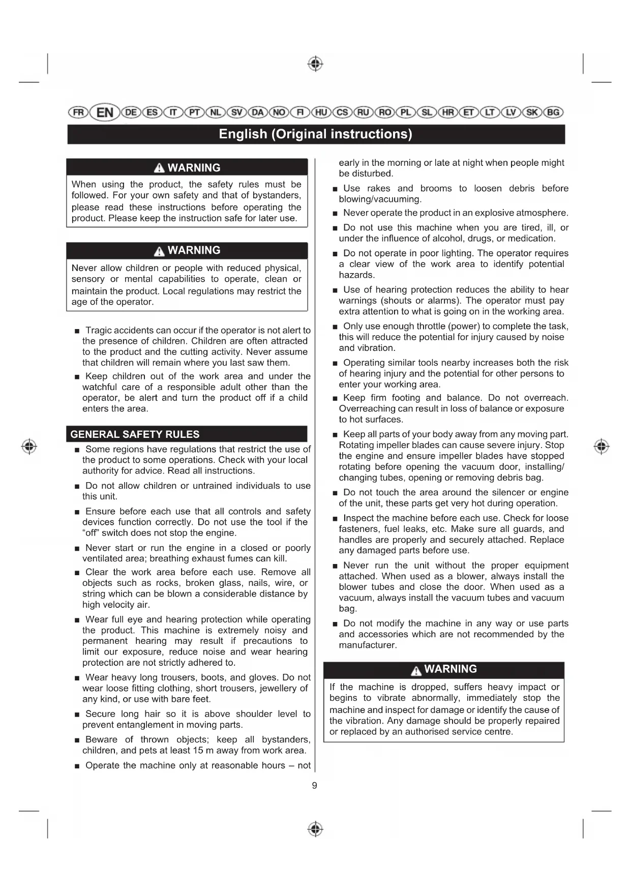 Ŷ Some regions have regulations that restrict the use of the product to some operations. Check with your local authority for advice. Read all instructions. Ŷ Do not allow children or untrained individuals to use this unit. Ŷ Ensure before each use that all controls and safety devices function correctly. Do not use the tool if the “off” switch does not stop the engine. Ŷ Never start or run the engine in a closed or poorly ventilated area; breathing exhaust fumes can kill. Ŷ Clear the work area before each use. Remove all objects such as rocks, broken glass, nails, wire, or string which can be blown a considerable distance by high velocity air. Ŷ Wear full eye and hearing protection while operating the product. This machine is extremely noisy and permanent hearing may result if precautions to limit our exposure, reduce noise and wear hearing protection are not strictly adhered to. Ŷ Wear heavy long trousers, boots, and gloves. Do not wear loose fitting clothing, short trousers, jewellery of any kind, or use with bare feet. Ŷ Secure long hair so it is above shoulder level to prevent entanglement in moving parts. Ŷ Beware of thrown objects; keep all bystanders, children, and pets at least 15 m away from work area. Ŷ Operate the machine only at reasonable hours – not early in the morning or late at night when people might be disturbed. Ŷ Use rakes and brooms to loosen debris before blowing/vacuuming. Ŷ Never operate the product in an explosive atmosphere. Ŷ Do not use this machine when you are tired, ill, or under the influence of alcohol, drugs, or medication. Ŷ Do not operate in poor lighting. The operator requires a clear view of the work area to identify potential hazards. Ŷ Use of hearing protection reduces the ability to hear warnings (shouts or alarms). The operator must pay extra attention to what is going on in the working area. Ŷ Only use enough throttle (power) to complete the task, this will reduce the potential for injury caused by noise and vibration. Ŷ Operating similar tools nearby increases both the risk of hearing injury and the potential for other persons to enter your working area. Ŷ Keep firm footing and balance. Do not overreach. Overreaching can result in loss of balance or exposure to hot surfaces. Ŷ Keep all parts of your body away from any moving part. Rotating impeller blades can cause severe injury. Stop the engine and ensure impeller blades have stopped rotating before opening the vacuum door, installing/ changing tubes, opening or removing debris bag. Ŷ Do not touch the area around the silencer or engine of the unit, these parts get very hot during operation. Ŷ Inspect the machine before each use. Check for loose fasteners, fuel leaks, etc. Make sure all guards, and handles are properly and securely attached. Replace any damaged parts before use. Ŷ Never run the unit without the proper equipment attached. When used as a blower, always install the blower tubes and close the door. When used as a vacuum, always install the vacuum tubes and vacuum bag. Ŷ Do not modify the machine in any way or use parts and accessories which are not recommended by the manufacturer. WARNING If the machine is dropped, suffers heavy impact or begins to vibrate abnormally, immediately stop the machine and inspect for damage or identify the cause of the vibration. Any damage should be properly repaired or replaced by an authorised service centre.10 English (Original instructions) Ŷ Stop the engine and allow it to cool before refuelling, storing or transporting the machine. Ŷ For refuelling and fuel mixing, chose an area away from sources of ignition (sparks, flames etc.), Flammable materials and which is well ventilated. Ŷ Do not smoke when mixing fuel or filling fuel tank. Ŷ Mix and store fuel in a container approved for fuel. Keep an appropriate type of fire extinguisher nearby for dealing with fuel fires. Ŷ Remember to securely refit the fuel tank filler cap before starting the engine. Ŷ Wipe up any fuel spillage. Move 10 m away from refuelling site before starting engine. Ŷ It has been reported that vibrations from hand-held tools may contribute to a condition called Raynaud’s Syndrome in certain individuals. Symptoms may include tingling, numbness and blanching of the fingers, usually apparent upon exposure to cold. Hereditary factors, exposure to cold and dampness, diet, smoking and work practices are all thought to contribute to the development of the these symptoms. There are measures that can be taken by the operator to possibly reduce the effects of vibration: Ɣ Keep your body warm in cold weather. When operating the unit wear gloves to keep the hands and wrists warm. It is reported that cold weather is a major factor contributing to Raynaud’s Syndrome. Ɣ After each period of operation, exercise to increase blood circulation. Ɣ Take frequent work breaks. Limit the amount of exposure per day. If you experience any of the symptoms of this condition, immediately discontinue use and see your doctor about these symptoms. WARNING Injuries may be caused, or aggravated, by prolonged use of a tool. When using any tool for prolonged periods, ensure you take regular breaks. Ŷ To reduce the risk of injury associated with contacting rotating parts, always stop the engine, remove the spark plug wire and make sure all moving parts have been come to a stop before Ɣ cleaning or clearing a blockage Ɣ leaving the product unattended Ɣ install or removing attachments Ɣ checking, maintenance or working on the machine WARNING Your back pack blower is fitted with a shoulder harness. Carefully adjust the harness to comfortably help to support the weight of the machine and secure it to your back. WARNING Identify how to operate the quick release mechanism and practice using it BEFORE you start using the machine. Its correct use may prevent serious injury in the case of an emergency. Never wear additional clothing over the harness or otherwise restrict acces