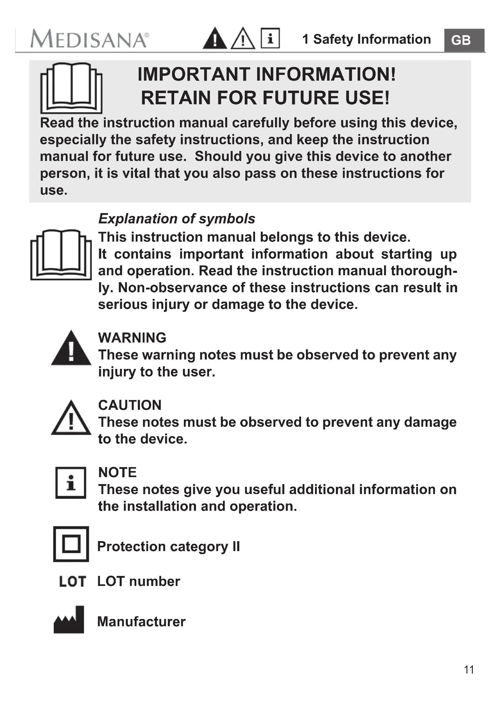 IMPORTANT INFORMATION! RETAIN FOR FUTURE USE! Read the instruction manual carefully before using this device, especially the safety instructions, and keep the instruction manual for future use. Should you give this device to another person, it is vital that you also pass on these instructions for use. Explanation of symbols This instruction manual belongs to this device. It contains important information about starting up and operation. Read the instruction manual thorough- ly. Non-observance of these instructions can result in serious injury or damage to the device. WARNING These warning notes must be observed to prevent any injury to the user. CAUTION These notes must be observed to prevent any damage to the device. NOTE These notes give you useful additional information on the installation and operation. LOT number