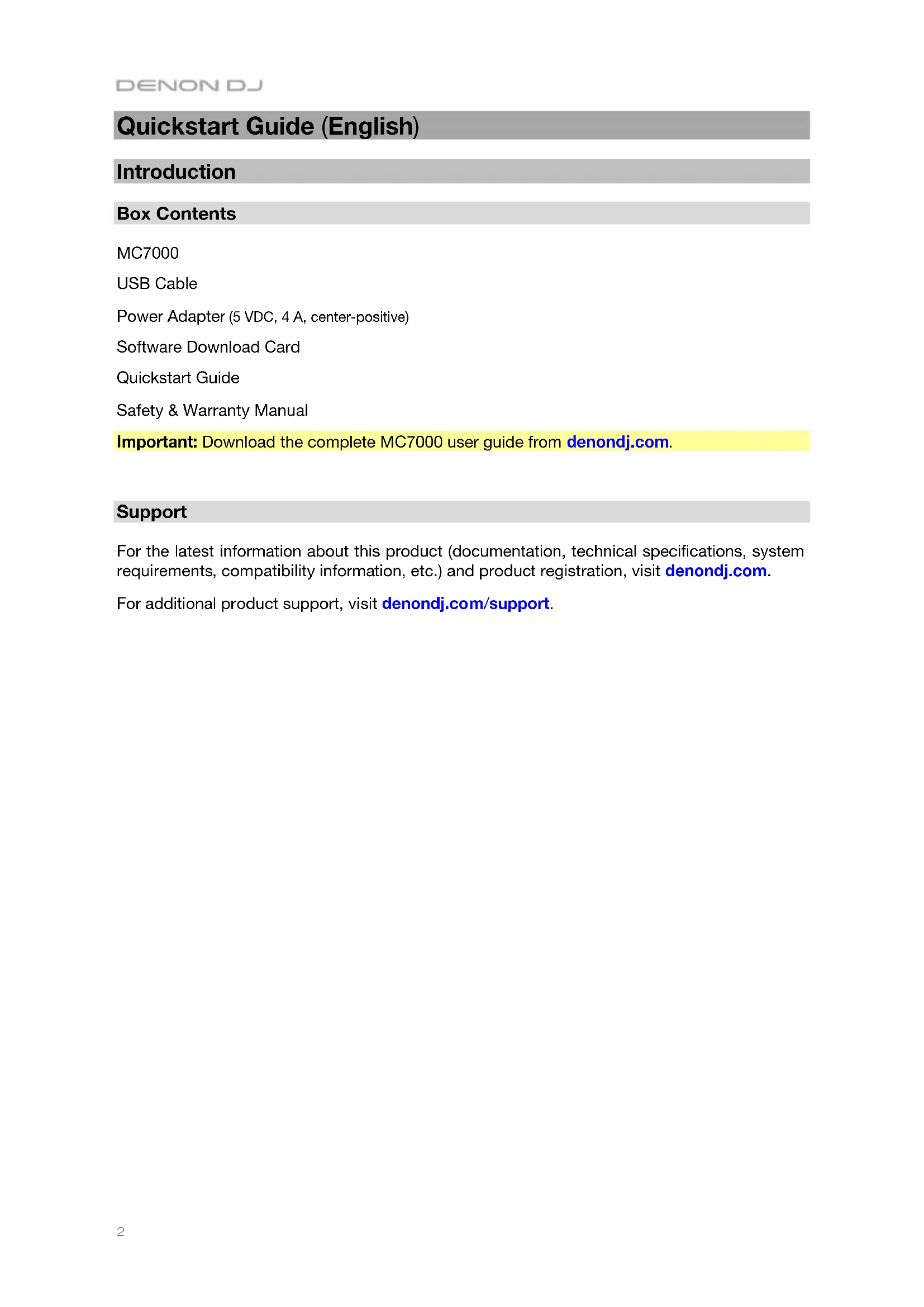 Setup Important: Occasionally, we may update MC7000’s firmware to improve its performance. Visit denondj.com to check for available firmware updates, especially after you update your software (firmware updates may address new software features). Note: Items not listed under the Introduction > Box Contents are sold separately.