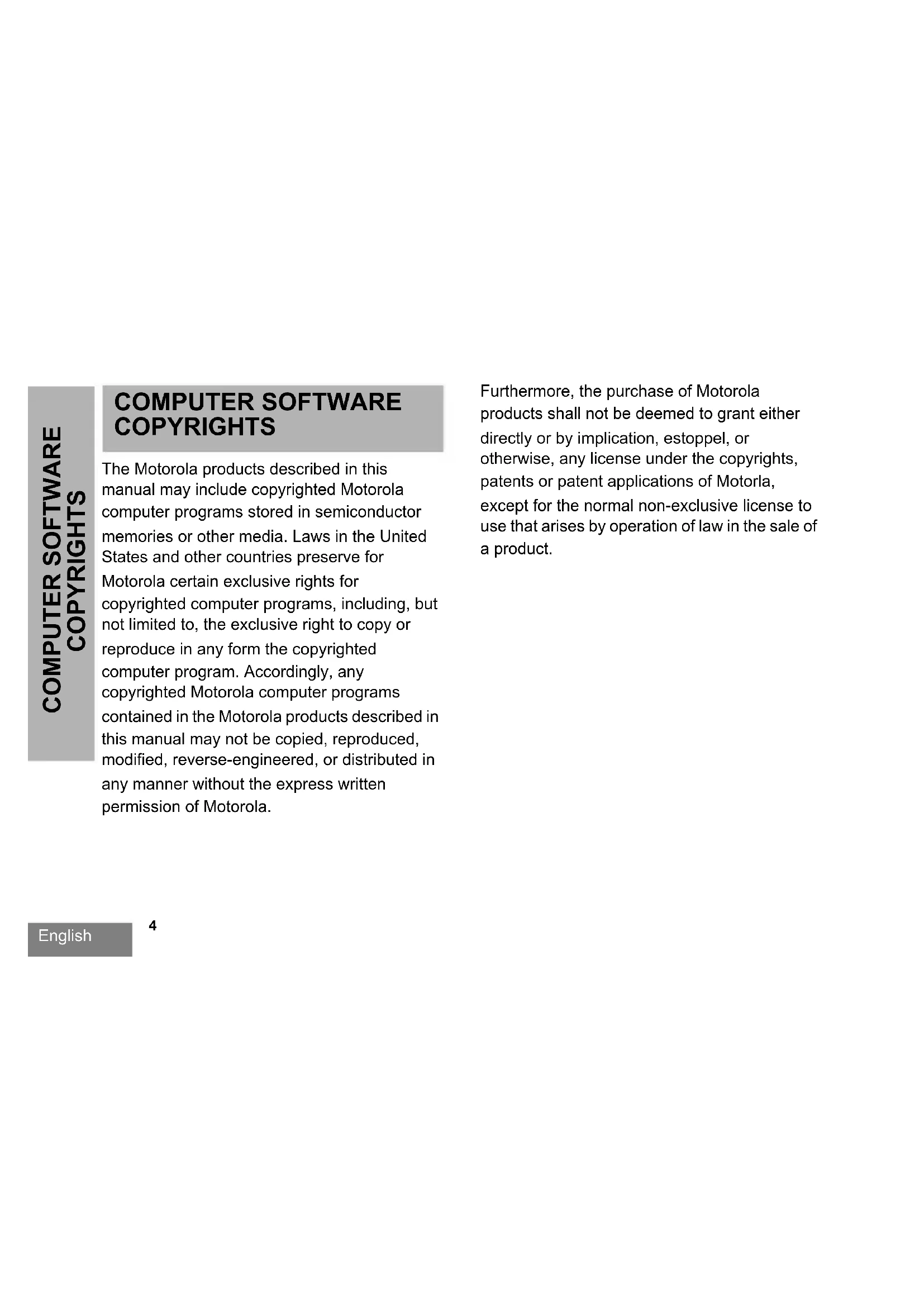 COMPUTER SOFTWARE COPYRIGHTS COMPUTER SOFTWARE COPYRIGHTS The Motorola products described in this manual may include copyrighted Motorola computer programs stored in semiconductor memories or other media. Laws in the United States and other countries preserve for Motorola certain exclusive rights for copyrighted computer programs, including, but not limited to, the exclusive right to copy or reproduce in any form the copyrighted computer program. Accordingly, any copyrighted Motorola computer programs contained in the Motorola products described in this manual may not be copied, reproduced, modified, reverse-engineered, or distributed in any manner without the express written permission of Motorola. Furthermore, the purchase of Motorola products shall not be deemed to grant either directly or by implication, estoppel, or otherwise, any license under the copyrights, patents or patent applications of Motorla, except for the normal non-exclusive license to use that arises by operation of law in the sale of a product.English
