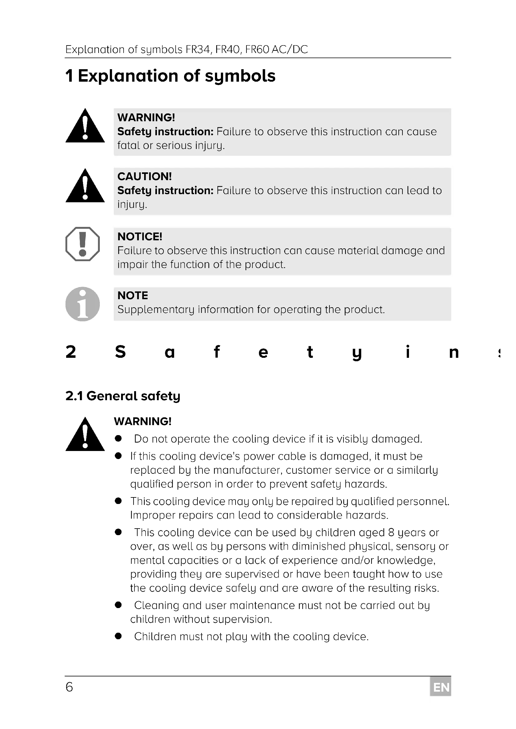 - Do not operate the cooling device if it is visibly damaged.