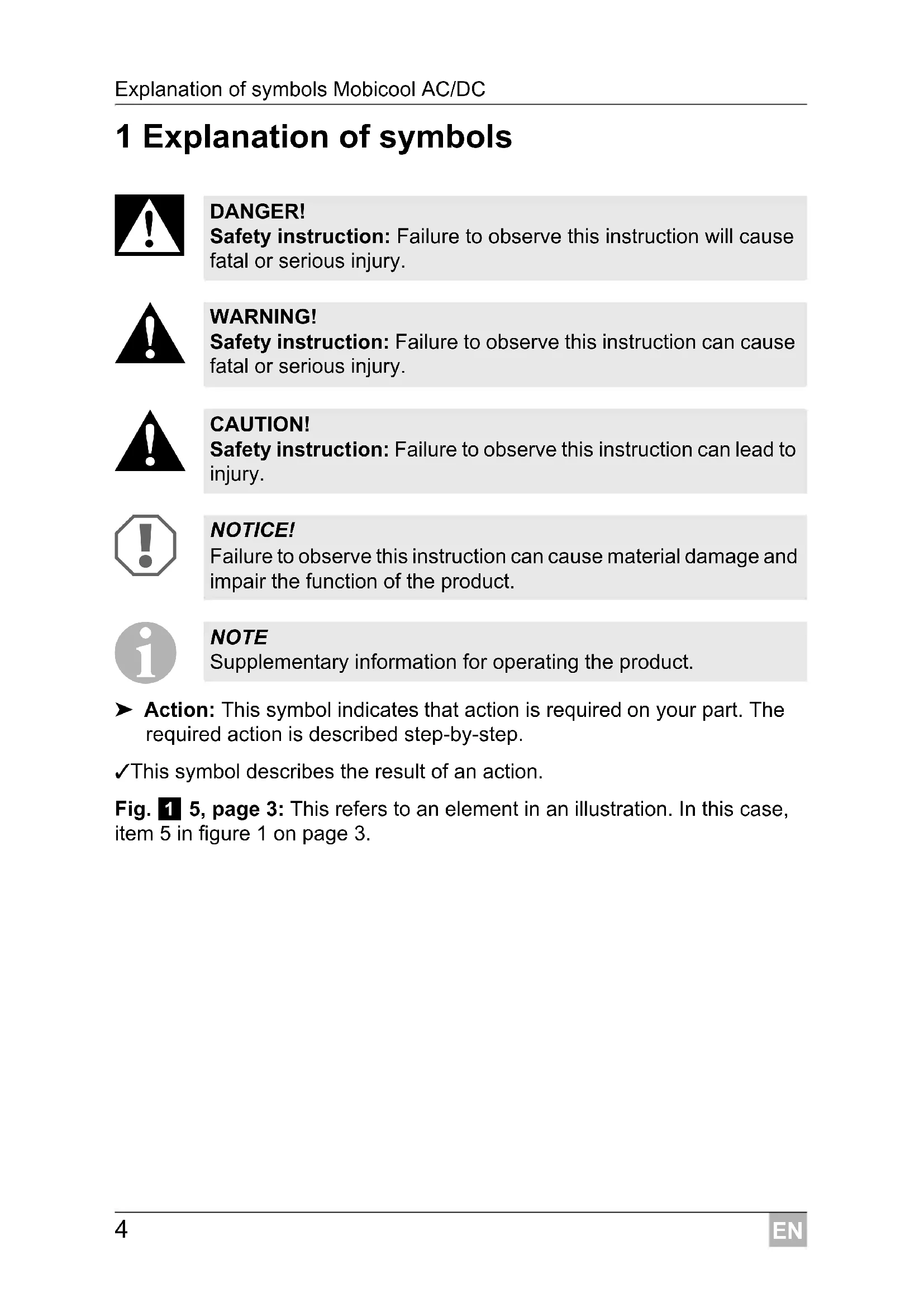 ➤ Action: This symbol indicates that action is required on your part. The required action is described step-by-step. ✓ This symbol describes the result of an action. Fig. 1 5, page 3: This refers to an element in an illustration. In this case, item 5 in figure 1 on page 3. DANGER! Safety instruction: Failure to observe this instruction will cause fatal or serious injury. WARNING! Safety instruction: Failure to observe this instruction can cause fatal or serious injury. CAUTION! Safety instruction: Failure to observe this instruction can lead to injury. NOTICE! Failure to observe this instruction can cause material damage and impair the function of the product. NOTE Supplementary information for operating the product.EN Mobicool AC/DC Safety instructions