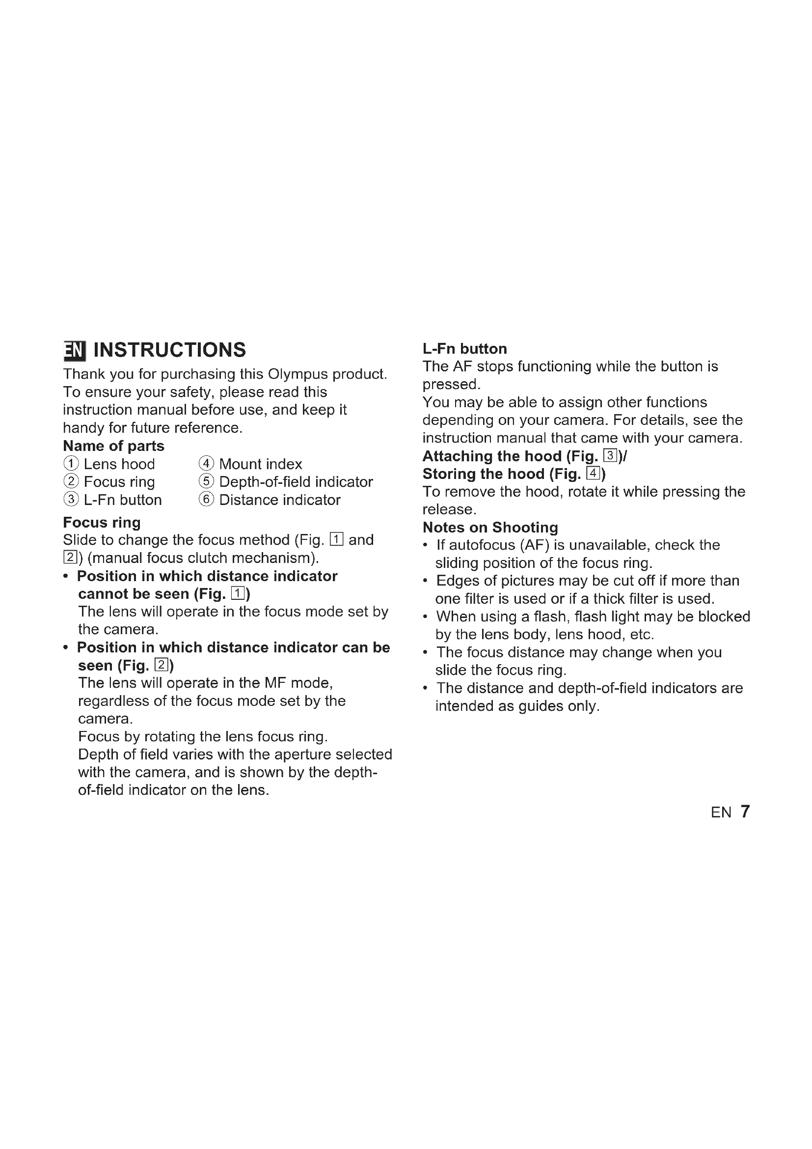 http://www.olympus.co.jp/en/support/imsg/ digicamera/download/notice/notice.cfmEN 7 INSTRUCTIONS Thank you for purchasing this Olympus product. To ensure your safety, please read this instruction manual before use, and keep it handy for future reference. Name of parts 1 Lens hood 2 Focus ring 3 L-Fn button 4 Mount index 5 Depth-of-field indicator 6 Distance indicator Focus ring Slide to change the focus method (Fig. 1 and