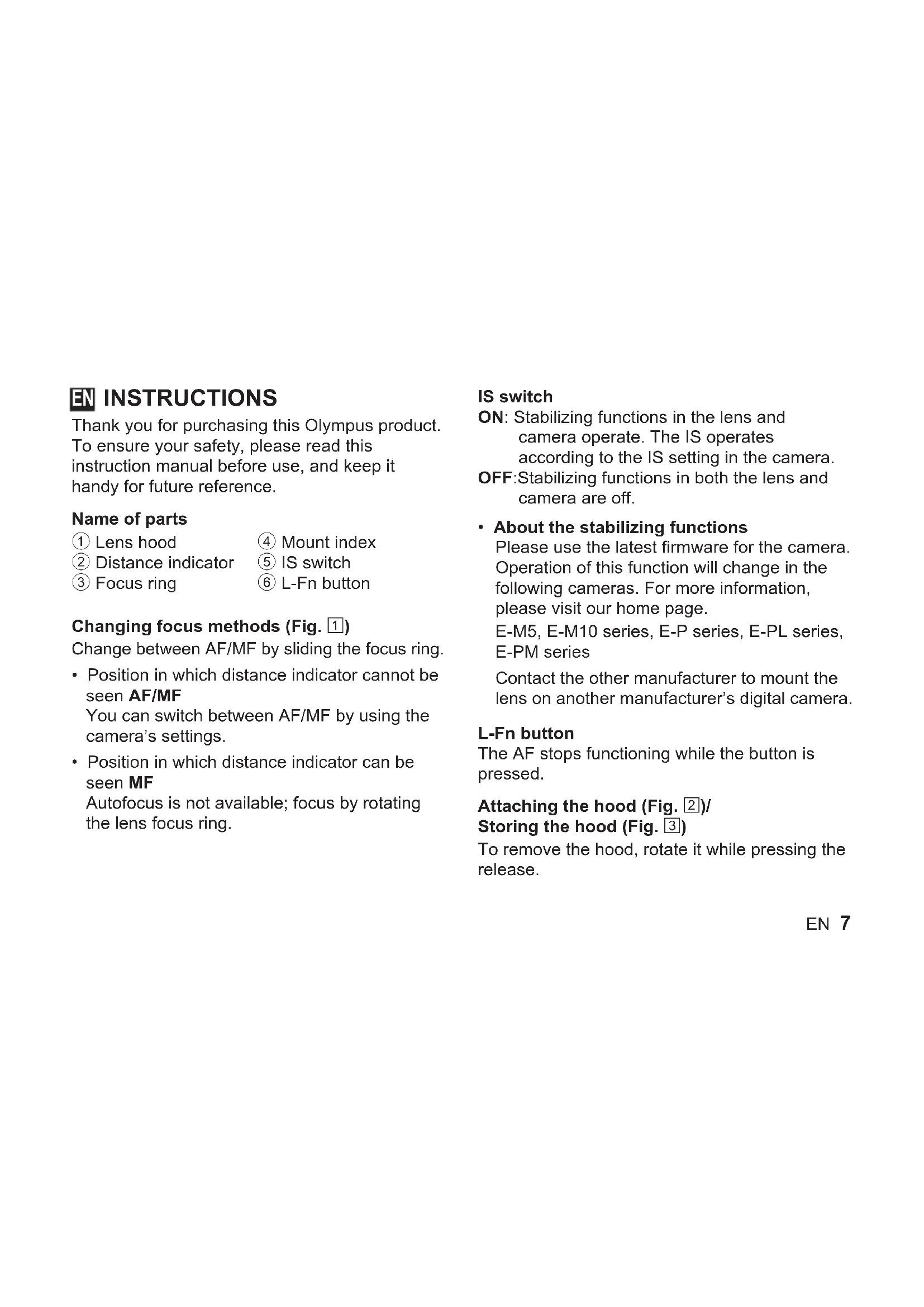 - About the stabilizing functions Please use the latest firmware for the camera. Operation of this function will change in the following cameras. For more information, please visit our home page. E-M5, E-M10 series, E-P series, E-PL series, E-PM series Contact the other manufacturer to mount the lens on another manufacturer’s digital camera. L-Fn button The AF stops functioning while the button is pressed. Attaching the hood (Fig. 2)/ Storing the hood (Fig. 3) To remove the hood, rotate it while pressing the release. EN8 EN Notes on Shooting