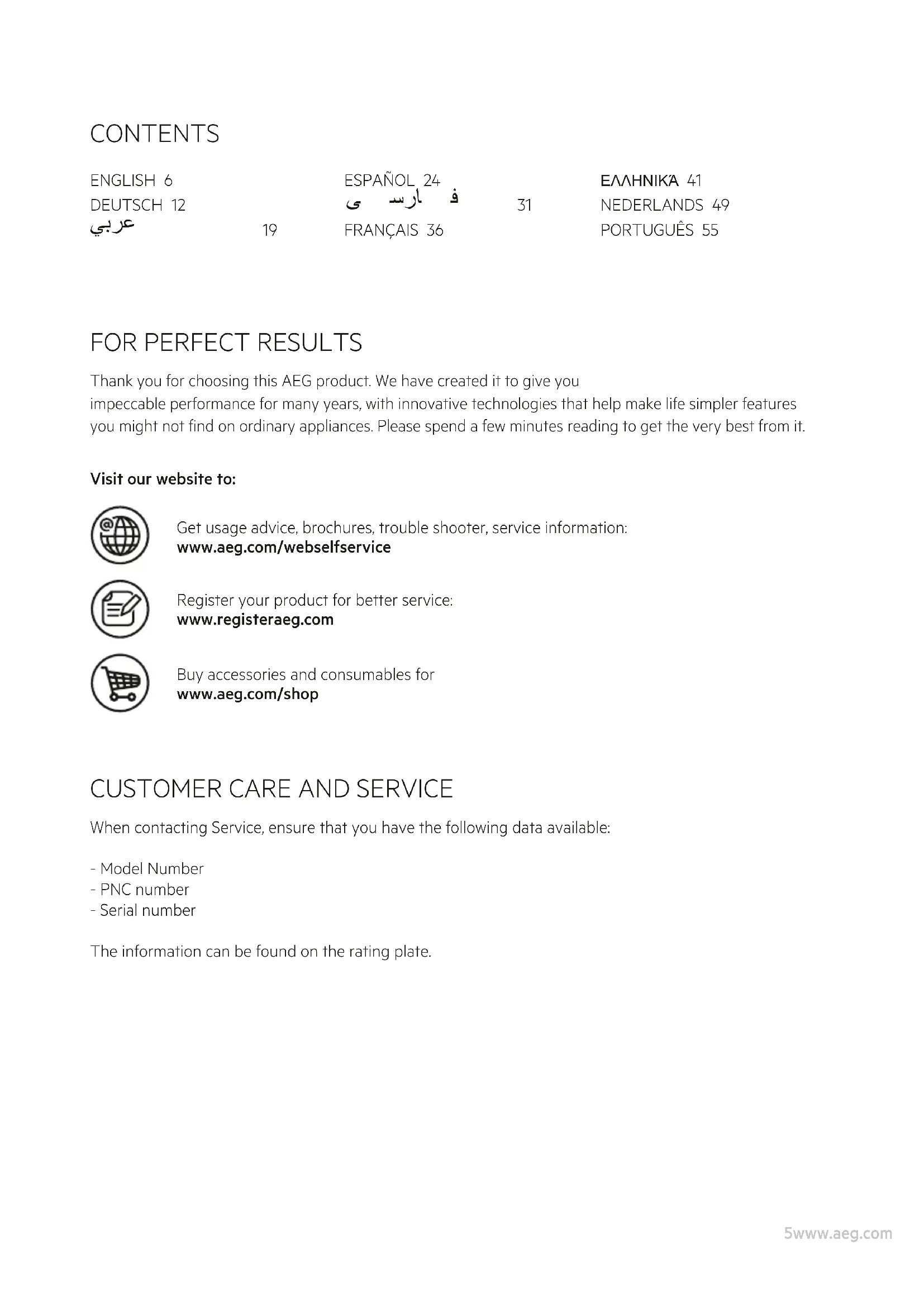 214www.aeg.com 225www.aeg.com Visit our website to: Get usage advice, brochures, trouble shooter, service information: www.aeg.com/webselfservice Register your product for better service: www.registeraeg.com Buy accessories and consumables for www.aeg.com/shop CONTENTS ENGLISH 6 DEUTSCH 12