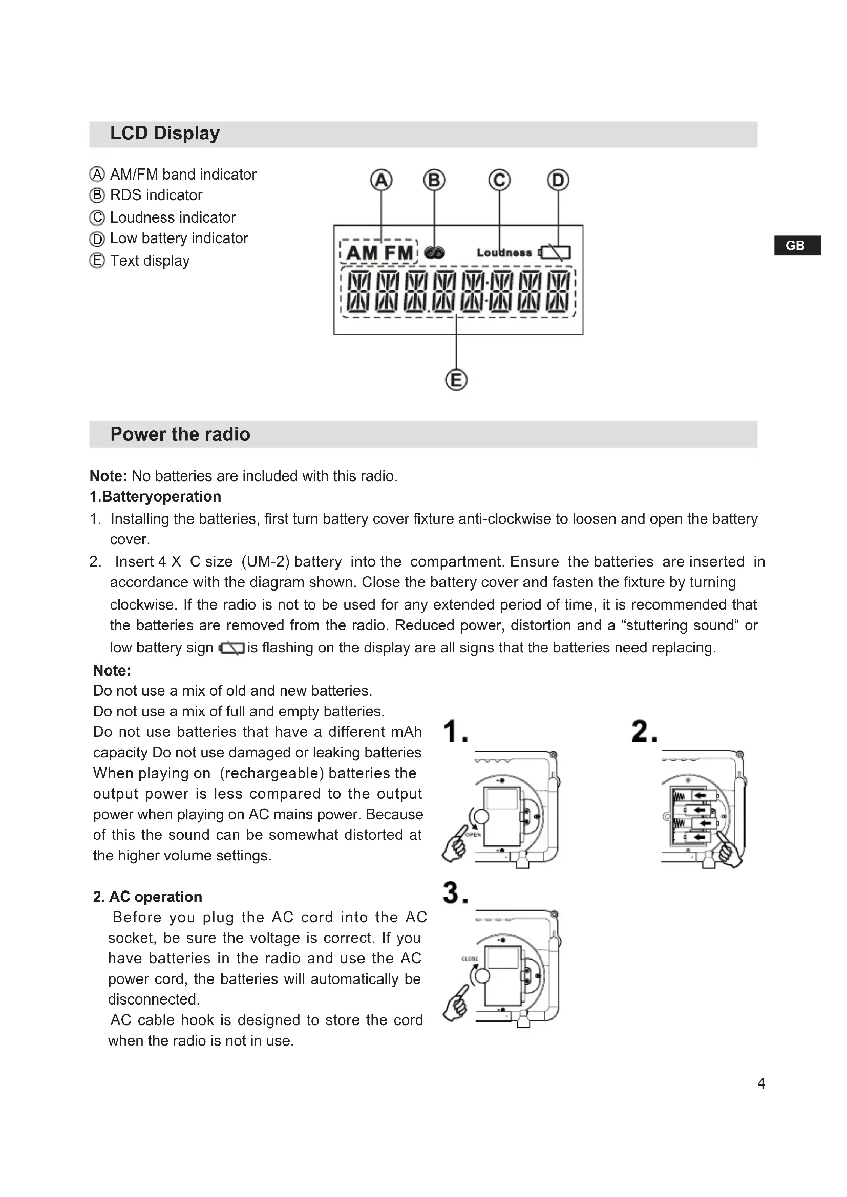 LCD Display AM/FM band indicator RDS indicator Loudness indicator Low battery indicator Text display Power the radio Note: No batteries are included with this radio.
