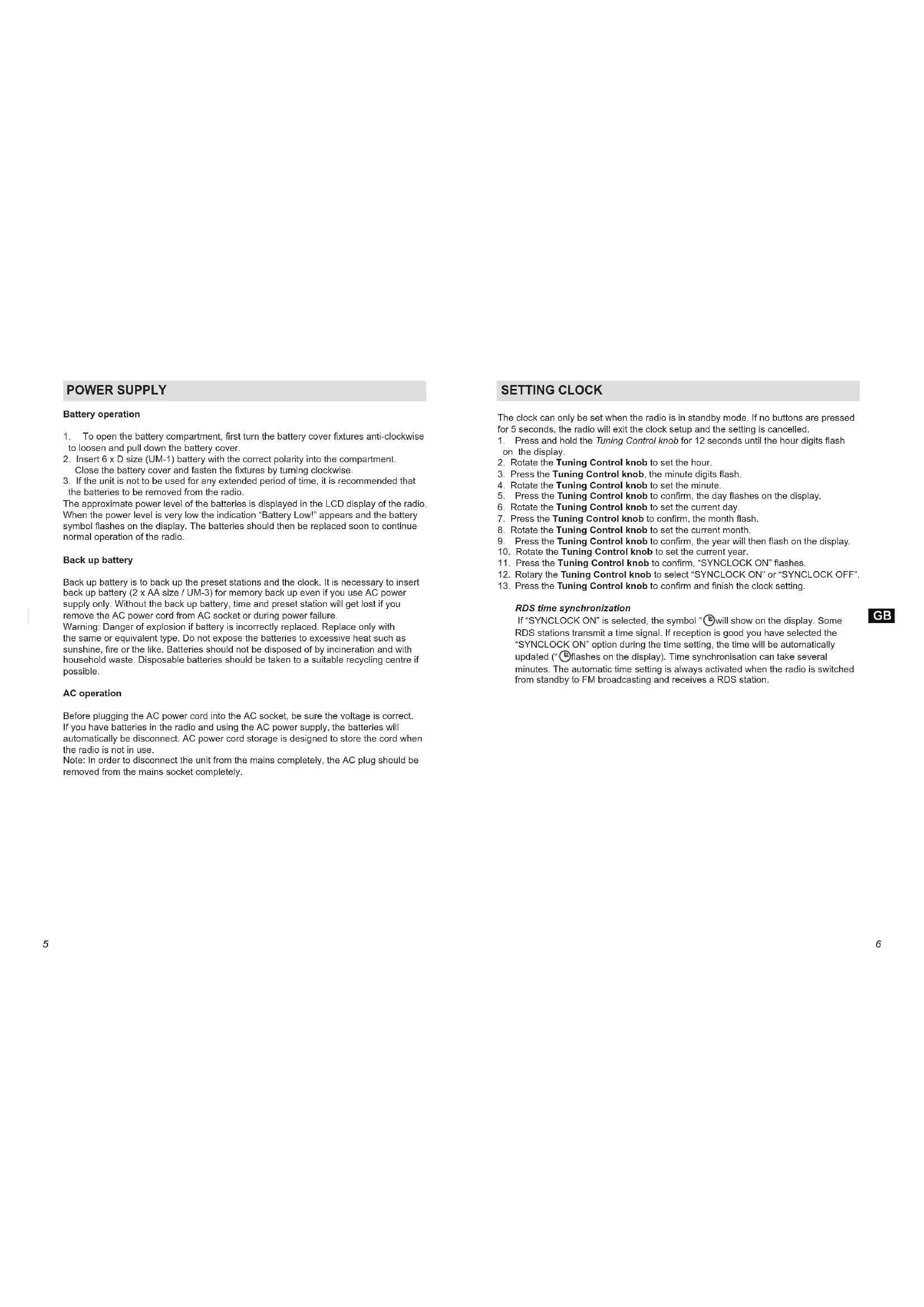 RDS time synchronization If “SYNCLOCK ON” is selected, the symbol “ ” will show on the display. Some RDS stations transmit a time signal. If reception is good you have selected the “SYNCLOCK ON” option during the time setting, the time will be automatically updated (“ ”ashesonthedisplay).Timesynchronisationcantakeseveral minutes. The automatic time setting is always activated when the radio is switched from standby to FM broadcasting and receives a RDS station.7 8