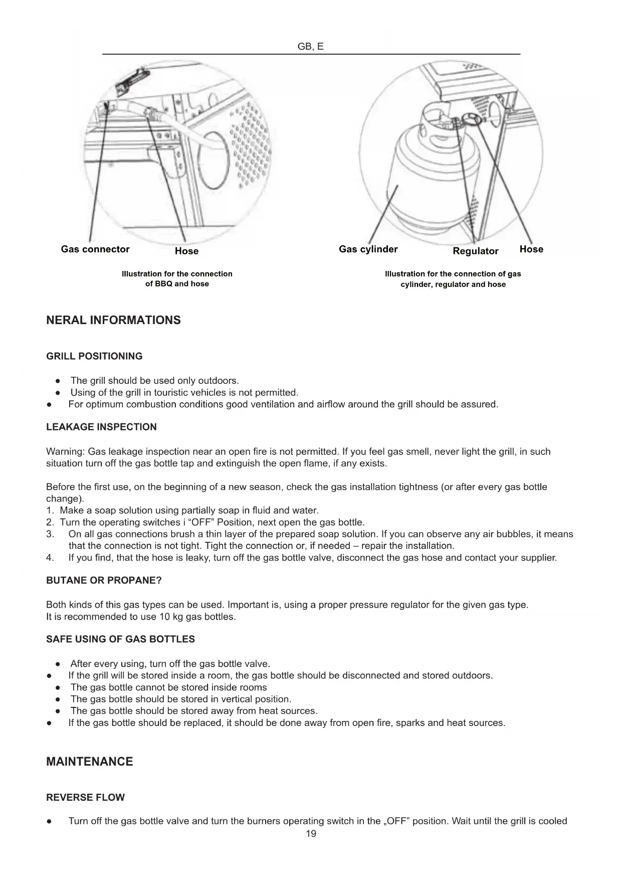 THIS EFFECT WAS NAMED AS „REVERSE FLOW“ AND CAN SERIOUSLY DAMAGE THE GRILL OR CAUSE A DANGEROUS FIRE. A CLEANING OF THE BURNERS (HIS OPENINGS), HOSES AND CONDUCTORS IS RECOMMENDED IN REGULAR INTERVALS.