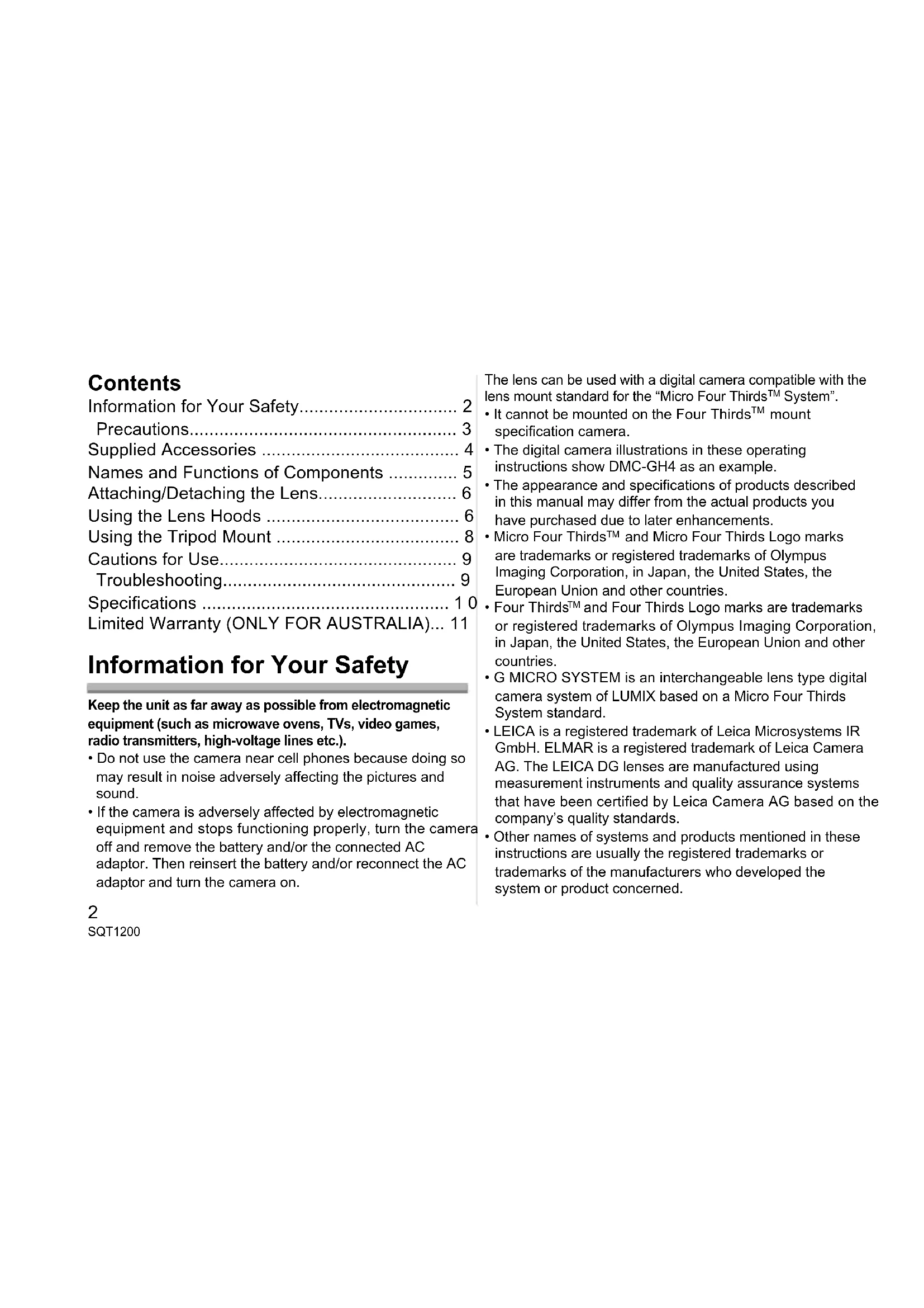 - Limited Warranty (ONLY FOR AUSTRALIA) Information for Your Safety Keep the unit as far away as possible from electromagnetic equipment (such as microwave ovens, TVs, video games, radio transmitters, high-voltage lines etc.).• Do not use the camera near cell phones because doing so may result in noise adversely affecting the pictures and sound.• If the camera is adversely affected by electromagnetic equipment and stops functioning properly, turn the camera off and remove the battery and/or the connected AC adaptor. Then reinsert the battery and/or reconnect the AC adaptor and turn the camera on.The lens can be used with a digital camera compatible with the lens mount standard for the “Micro Four Thirds System”.• It cannot be mounted on the Four Thirds p. 11