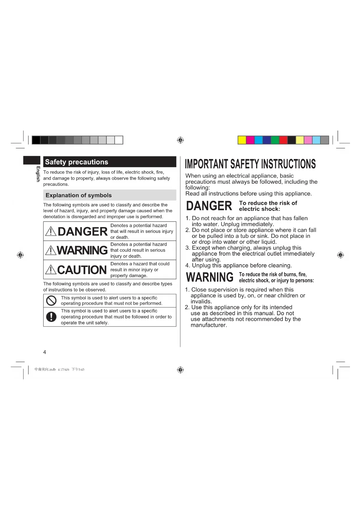 CAUTION Protecting the skin Do not press the blade strongly against your skin or lips. Do not use this product for any purpose other than trimming beard and hair. Do not directly apply the blades on ears or rough skin (such as swellings, injuries and blemishes). - Doing so may cause injury to ears or uneven skin. Check that the blades are not damaged or deformed before use. - Failure to do so may cause skin injury. Note the following precautions Do not allow metal objects or trash to adhere to the power plug or the charging plug. - Doing so may cause electric shock or re due to a short circuit. Do not drop it or expose it to shock. - Doing so may cause injury. Disconnect the power plug from the household outlet when not using. - Failure to do so may cause electric shock or re due to electrical leakage resulting from insulation deterioration. 中南美向.indb 7 17/4/6 下午5:458 English