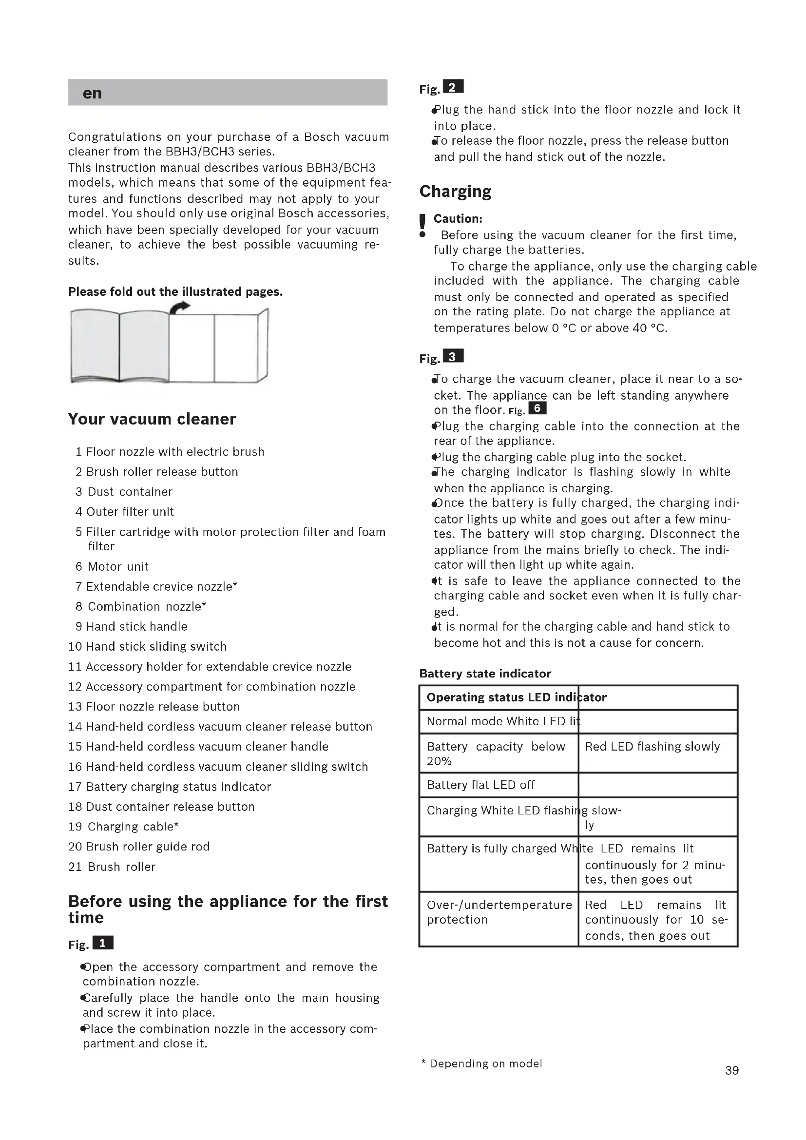 Congratulations on your purchase of a Bosch vacuum cleaner from the BBH3/BCH3 series. This instruction manual describes various BBH3/BCH3 models, which means that some of the equipment fea- tures and functions described may not apply to your model. You should only use original Bosch accessories, which have been specially developed for your vacuum cleaner, to achieve the best possible vacuuming re- sults. Please fold out the illustrated pages. Your vacuum cleaner 1 Floor nozzle with electric brush 2 Brush roller release button 3 Dust container 4 Outer filter unit 5 Filter cartridge with motor protection filter and foam filter 6 Motor unit 7 Extendable crevice nozzle* 8 Combination nozzle* 9 Hand stick handle 10 Hand stick sliding switch 11 Accessory holder for extendable crevice nozzle 12 Accessory compartment for combination nozzle 13 Floor nozzle release button 14 Hand-held cordless vacuum cleaner release button 15 Hand-held cordless vacuum cleaner handle 16 Hand-held cordless vacuum cleaner sliding switch 17 Battery charging status indicator 18 Dust container release button 19 Charging cable* 20 Brush roller guide rod 21 Brush roller Before using the appliance for the first time Fig.