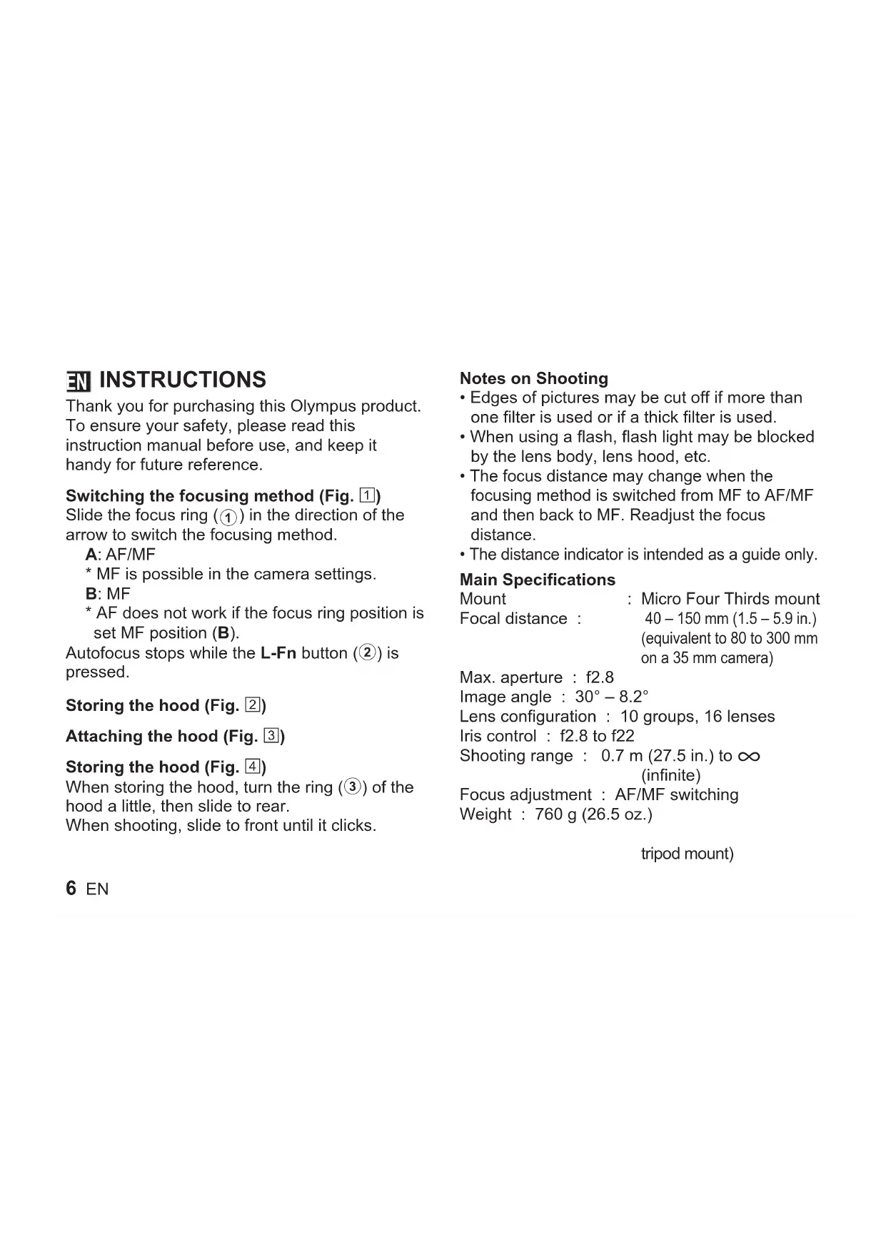 01L1042JUABjp.indd501L1042JUABjp.indd5 2014/08/2519:00:222014/08/2519:00:226 EN INSTRUCTIONS Thank you for purchasing this Olympus product. To ensure your safety, please read this instruction manual before use, and keep it handy for future reference. Switching the focusing method (Fig. 1) Slide the focus ring (