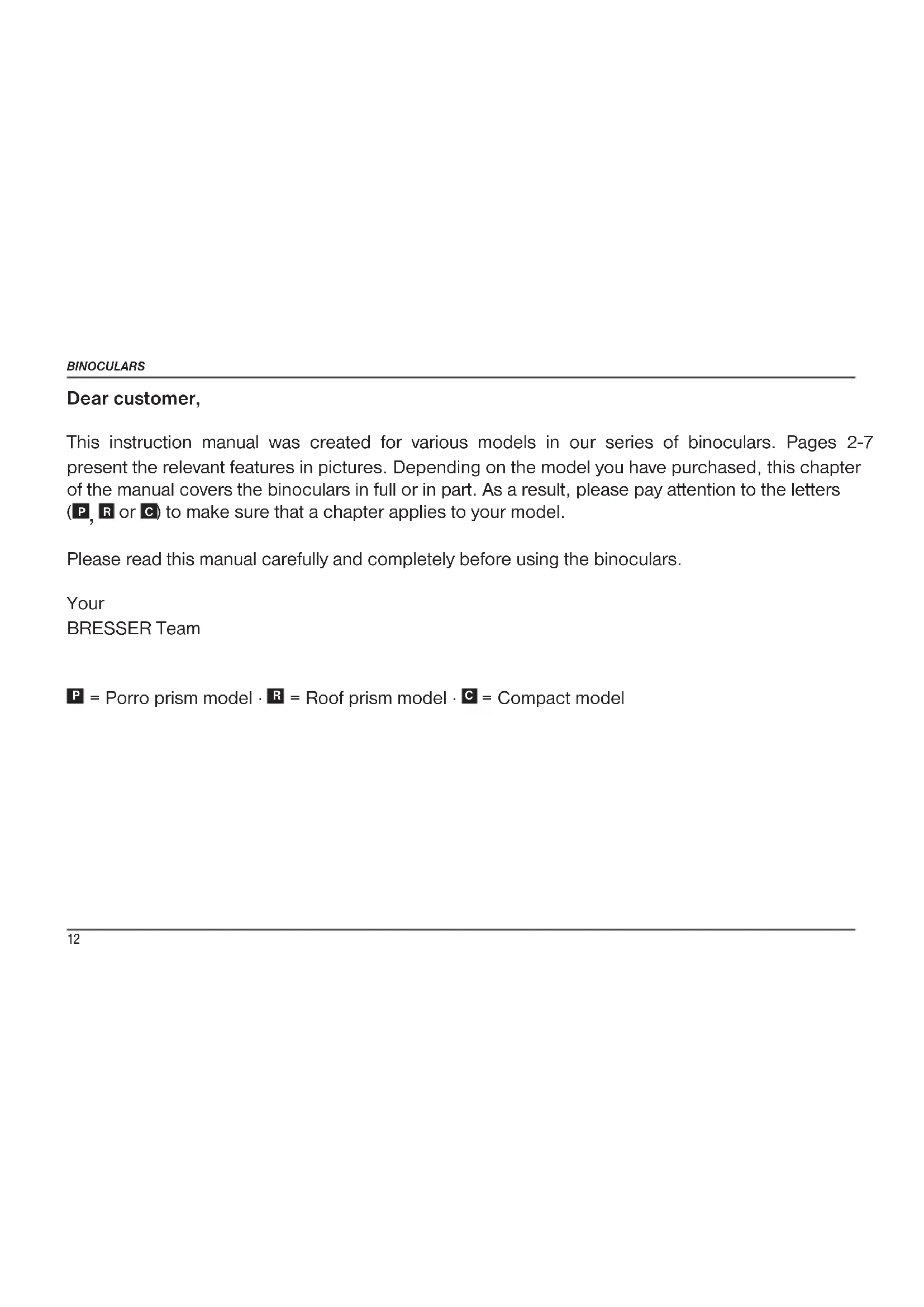 ) to make sure that a chapter applies to your model. Please read this manual carefully and completely before using the binoculars. Your BRESSER Team