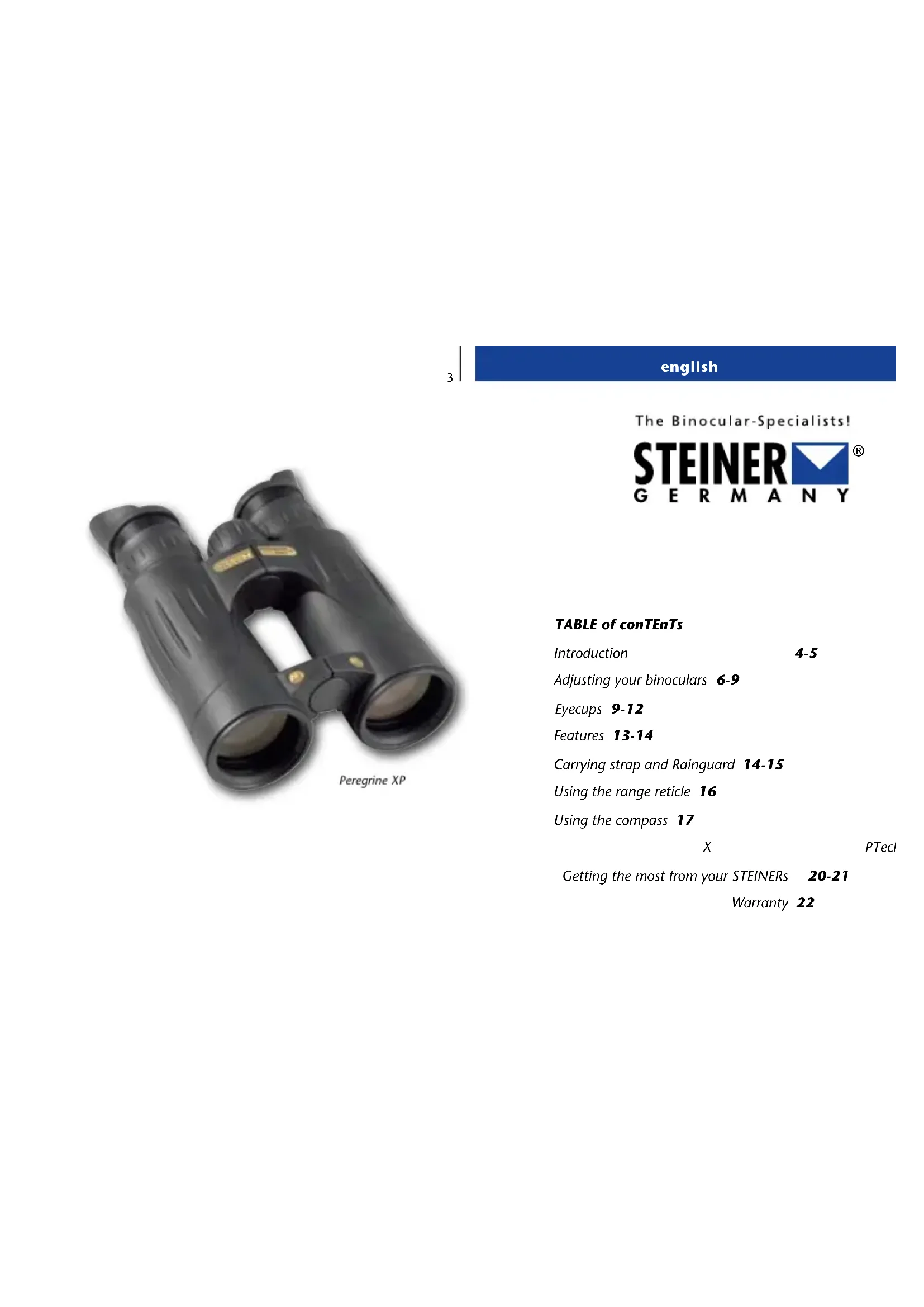 Designed into this product are six decades of experience in manufacturing binoculars for the highest demands as well as years of dedicated research. This manual will provide you with all the necessary instructions and tips to ensure you the maximum use and enjoyment of your new STEINERs.