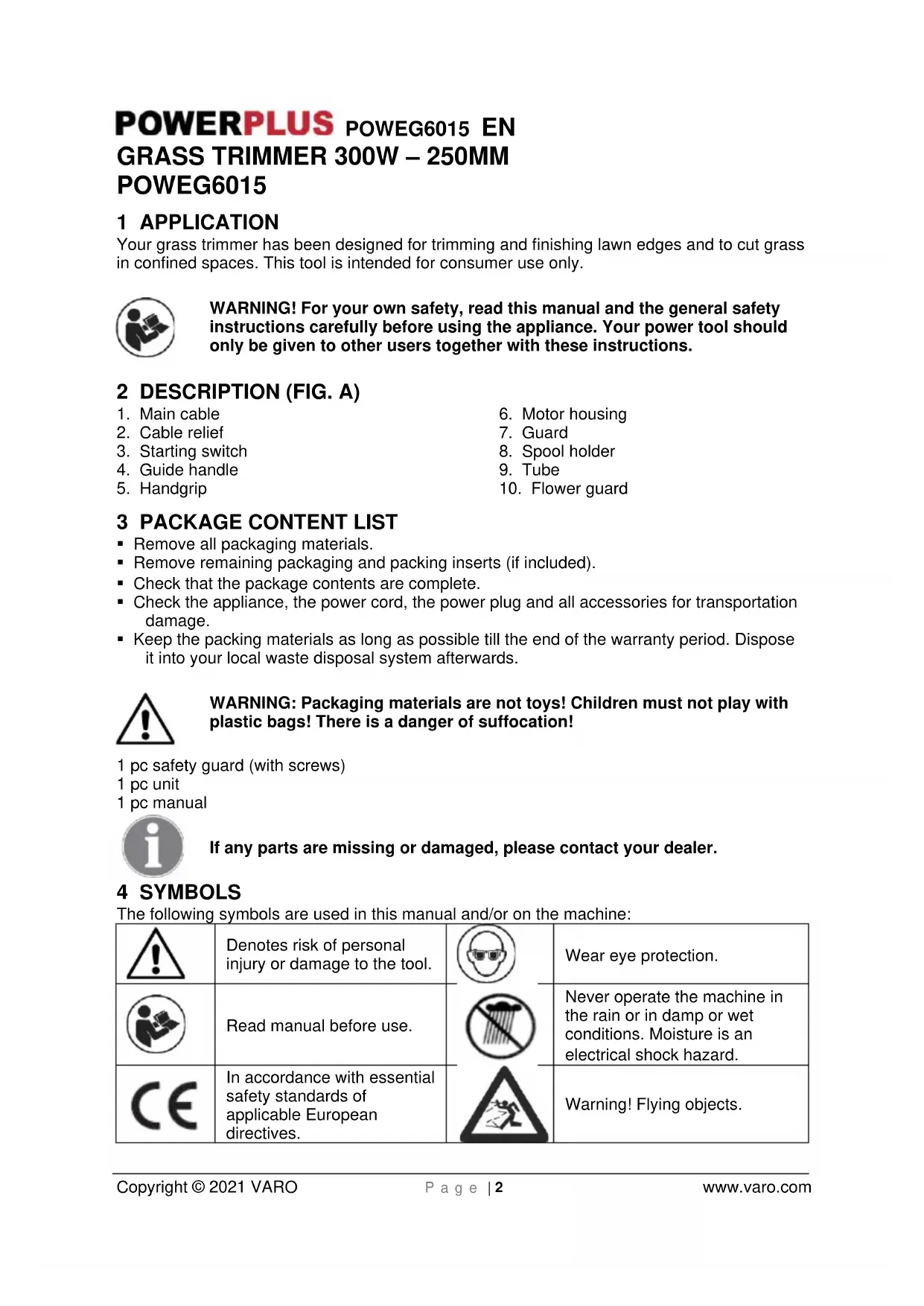 VARO- Vic. Van Rompuy N.V. - Joseph Van Instraat 9 - BE2500 Lier - BELGIUM, declares that, product: Grass trimmer trade mark: PowerPlus model: POWEG6015 is in conformity with the essential requirements and other relevant provisions of the applicable European Directives, based on the application of European harmonized standards. Any unauthorized modification of the apparatus voids this declaration. European Directives (including, if applicable, their amendments up to the date of signature); 2011/65/EU 2006/42/EC 2014/30/EU 2000/14/EC Annex VI LwA Measured 91dB(A) Guaranteed 96dB(A) Notified Body TuV Sud - DE European harmonized standards (including, if applicable, their amendments up to the date of signature); EN60335-1 : 2012 EN50636-2-91 : 2014 EN55014-1 : 2017 EN55014-2 : 2015 EN61000-3-2 : 2014 EN61000-3-3 : 2013 Keeper of the Technical Documentation : Philippe Vankerkhove, VARO – Vic. Van Rompuy N.V. The undersigned acts on behalf of the company CEO, Philippe Vankerkhove Regulatory Affairs – Compliance Manager 26/05/2021, Lier-BelgiumPOWEG6015 DE Copyright © 2021 VARO S e i t e | 1 www.varo.com 1 EINSATZBEREICH .......................................................................... 2