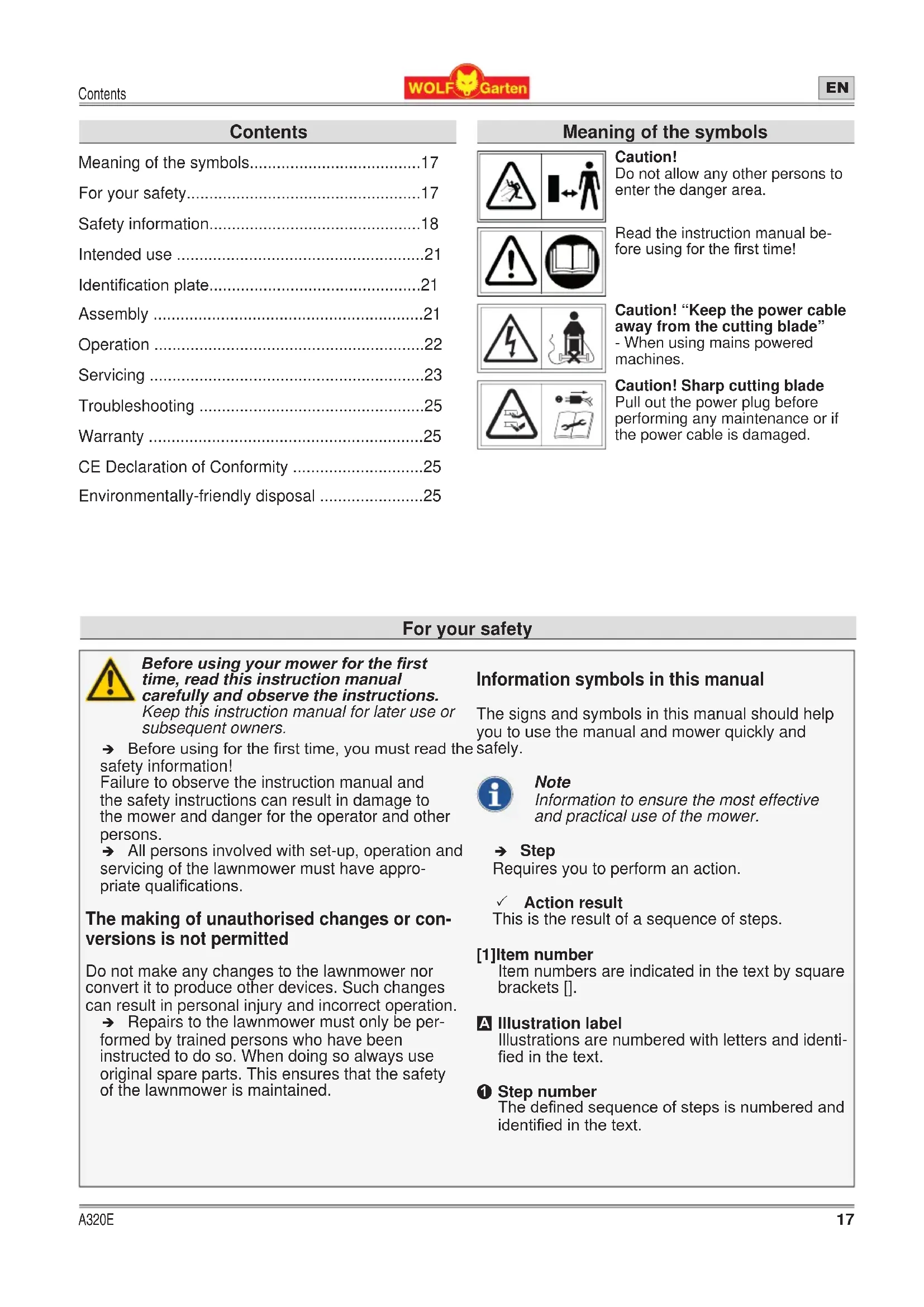 Download the instructions for your Lawn mower in PDF format for free! Find your manual A 320 E - Wolf Garten and take your electronic device back in hand. On this page are published all the documents necessary for the use of your device. A 320 E by Wolf Garten.