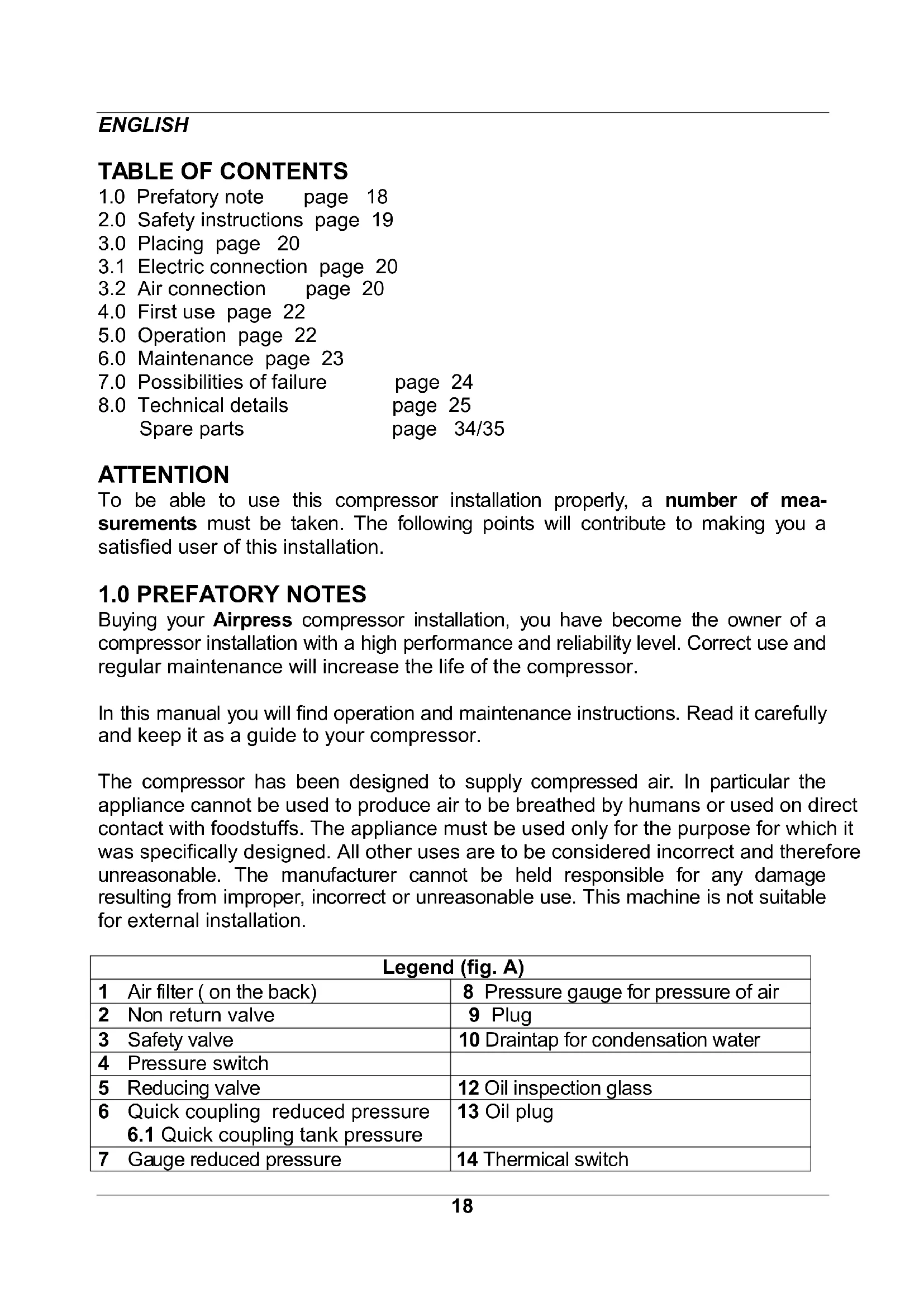 0 PREFATORY NOTES Buying your Airpress compressor installation, you have become the owner of a compressor installation with a high performance and reliability level. Correct use and regular maintenance will increase the life of the compressor. In this manual you will find operation and maintenance instructions. Read it carefully and keep it as a guide to your compressor. The compressor has been designed to supply compressed air. In particular the appliance cannot be used to produce air to be breathed by humans or used on direct contact with foodstuffs. The appliance must be used only for the purpose for which it was specifically designed. All other uses are to be considered incorrect and therefore unreasonable. The manufacturer cannot be held responsible for any damage resulting from improper, incorrect or unreasonable use. This machine is not suitable for external installation. Legend (fig. A) 1 Ai r filter ( on the back) 8 Pressure gauge for pressure of air 2 No n return valve 9 Plug 3 Sa fety valve 10 Draintap for condensation water 4 Pr essure switch 5 Reducing valve 12 Oil inspection glass 6 Quick coupling reduced pressure