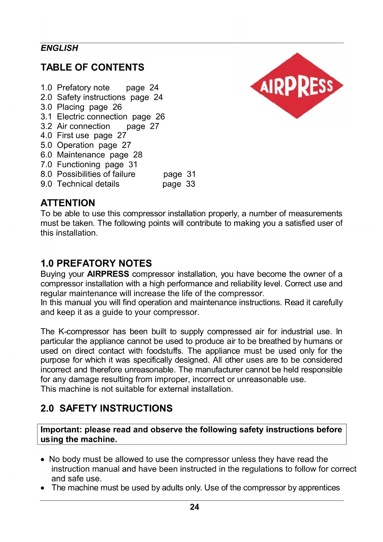 ying your AIRPRESS compressor installation, you have become the owner of a compressor installation with a high performance and reliability level. Correct use and regular maintenance will increase the life of the compressor. In this manual you will find operation and maintenance instructions. Read it carefully and keep it as a guide to your compressor. The K-compressor has been built to supply compressed air for industrial use. In particular the appliance cannot be used to produce air to be breathed by humans or used on direct contact with foodstuffs. The appliance must be used only for the purpose for which it was specifically designed. All other uses are to be considered incorrect and therefore unreasonable. The manufacturer cannot be held responsible for any damage resulting from improper, incorrect or unreasonable use. This machine is not suitable for external installation.