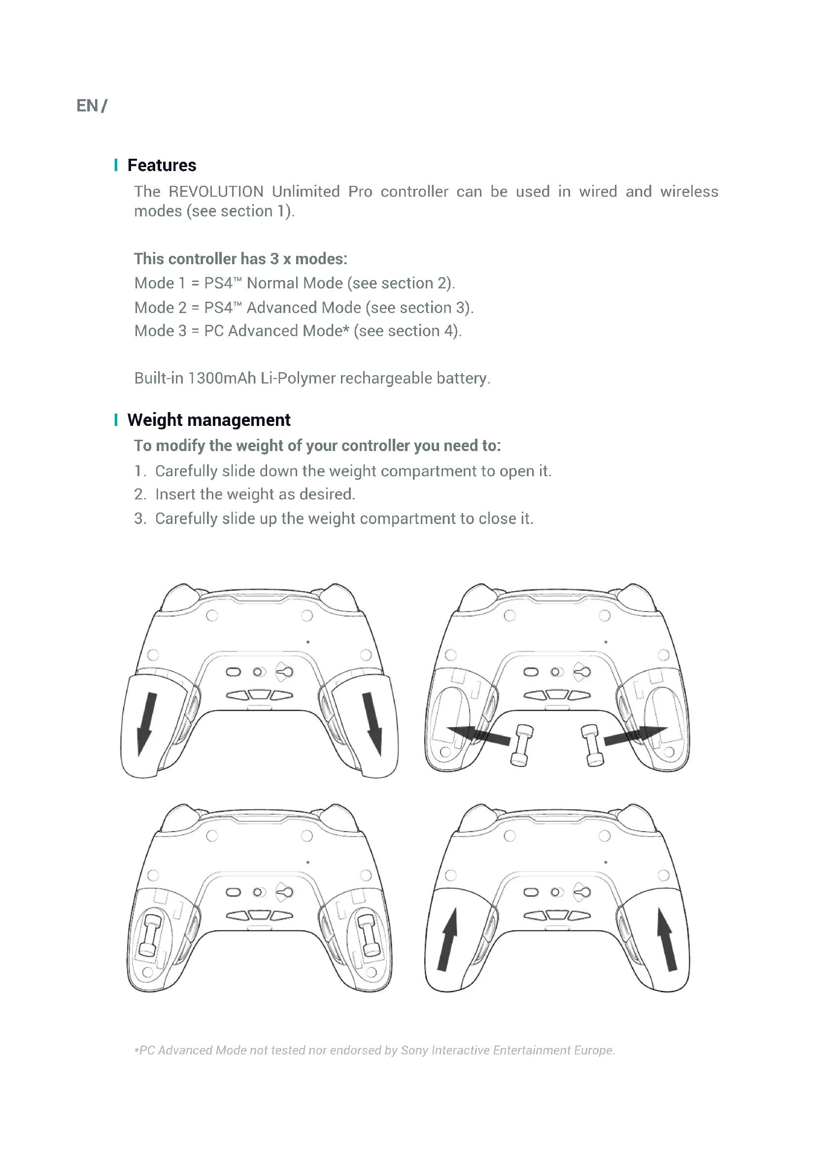 22/ Microphone mute button/ Battery level (hold) 23/ Volume DOWN 24/ Volume UP 25/ USB Plug & Play Wireless receiver 26/ Sync button 27/ Sync LEDEN / I Features The REVOLUTION Unlimited Pro controller can be used in wired and wireless modes (see section 1). This controller has 3 x modes: Mode 1 = PS4™ Normal Mode (see section 2). Mode 2 = PS4™ Advanced Mode (see section 3). Mode 3 = PC Advanced Mode* (see section 4). Built-in 1300mAh Li-Polymer rechargeable battery. I Weight management To modify the weight of your controller you need to:
