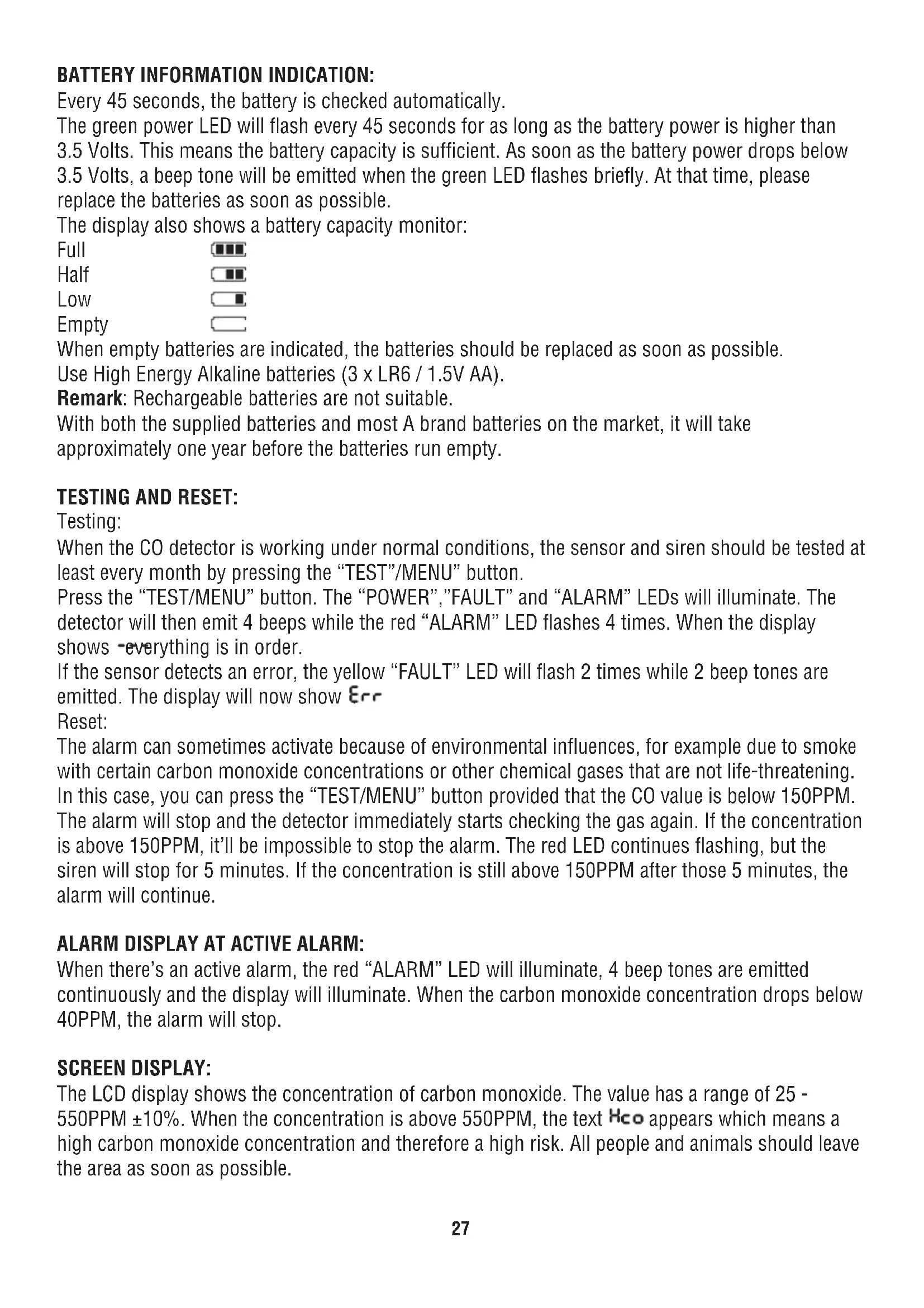 replace the batteries as soon as possible. The display also shows a battery capacity monitor: Full Half Low Empty When empty batteries are indicated, the batteries should be replaced as soon as possible. Use High Energy Alkaline batteries (3 x LR6 / 1.5V AA). Remark: Rechargeable batteries are not suitable. With both the supplied batteries and most A brand batteries on the market, it will take approximately one year before the batteries run empty. TESTING AND RESET: Testing: When the CO detector is working under normal conditions, the sensor and siren should be tested at least every month by pressing the “TEST”/MENU” button. Press the “TEST/MENU” button. The “POWER”,”FAULT” and “ALARM” LEDs will illuminate. The detector will then emit 4 beeps while the red “ALARM” LED flashes 4 times. When the display shows everything is in order. If the sensor detects an error, the yellow “FAULT” LED will flash 2 times while 2 beep tones are emitted. The display will now show . Reset: The alarm can sometimes activate because of environmental influences, for example due to smoke with certain carbon monoxide concentrations or other chemical gases that are not life-threatening. In this case, you can press the “TEST/MENU” button provided that the CO value is below 150PPM. The alarm will stop and the detector immediately starts checking the gas again. If the concentration is above 150PPM, it’ll be impossible to stop the alarm. The red LED continues flashing, but the siren will stop for 5 minutes. If the concentration is still above 150PPM after those 5 minutes, the alarm will continue. ALARM DISPLAY AT ACTIVE ALARM: When there’s an active alarm, the red “ALARM” LED will illuminate, 4 beep tones are emitted continuously and the display will illuminate. When the carbon monoxide concentration drops below 40PPM, the alarm will stop. SCREEN DISPLAY: The LCD display shows the concentration of carbon monoxide. The value has a range of 25 - 550PPM ±10%. When the concentration is above 550PPM, the text appears which means a high carbon monoxide concentration and therefore a high risk. All people and animals should leave the area as soon as possible.28 SENSOR FAULT INSPECTION: When the CO detector is active and functions in standby mode, only the carbon monoxide is automatically tested every 2 minutes to verify its proper working. You can use the “TEST/MENU” button to manually test both the carbon monoxide sensor and the alarm signal. When the detector identifies an error, it will continuously emit 2 beep tones and, in addition to this sound, the yellow “FAULT” LED will illuminate. The display will also light up and show