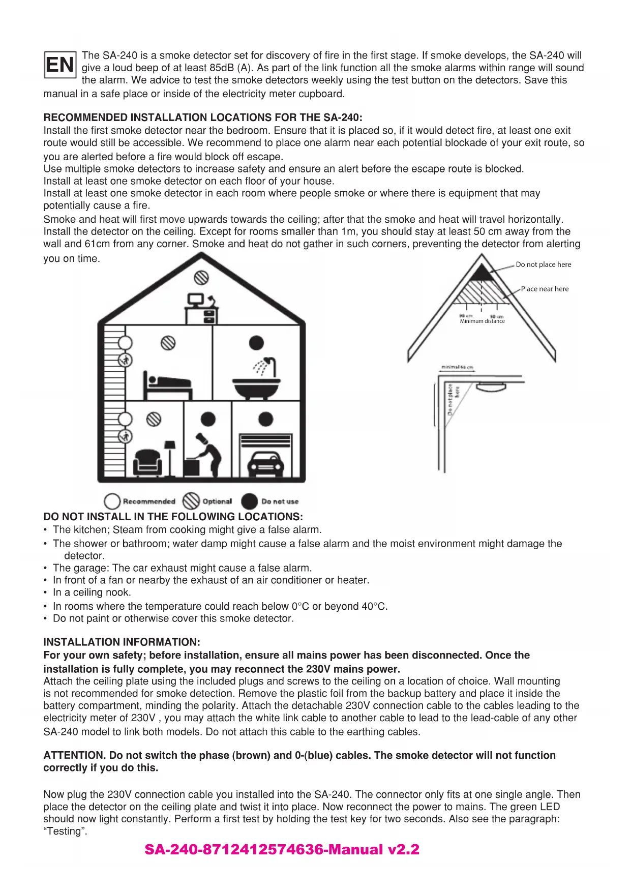 SA-240-8712412574636-Manual v2.2The SA-240 is a smoke detector set for discovery of fire in the first stage. If smoke develops, the SA-240 will give a loud beep of at least 85dB (A). As part of the link function all the smoke alarms within range will sound the alarm. We advice to test the smoke detectors weekly using the test button on the detectors. Save this manual in a safe place or inside of the electricity meter cupboard. RECOMMENDED INSTALLATION LOCATIONS FOR THE SA-240: Install the first smoke detector near the bedroom. Ensure that it is placed so, if it would detect fire, at least one exit route would still be accessible. We recommend to place one alarm near each potential blockade of your exit route, so you are alerted before a fire would block off escape. Use multiple smoke detectors to increase safety and ensure an alert before the escape route is blocked. Install at least one smoke detector on each floor of your house. Install at least one smoke detector in each room where people smoke or where there is equipment that may potentially cause a fire. Smoke and heat will first move upwards towards the ceiling; after that the smoke and heat will travel horizontally. Install the detector on the ceiling. Except for rooms smaller than 1m, you should stay at least 50 cm away from the wall and 61cm from any corner. Smoke and heat do not gather in such corners, preventing the detector from alerting you on time. DO NOT INSTALL IN THE FOLLOWING LOCATIONS: