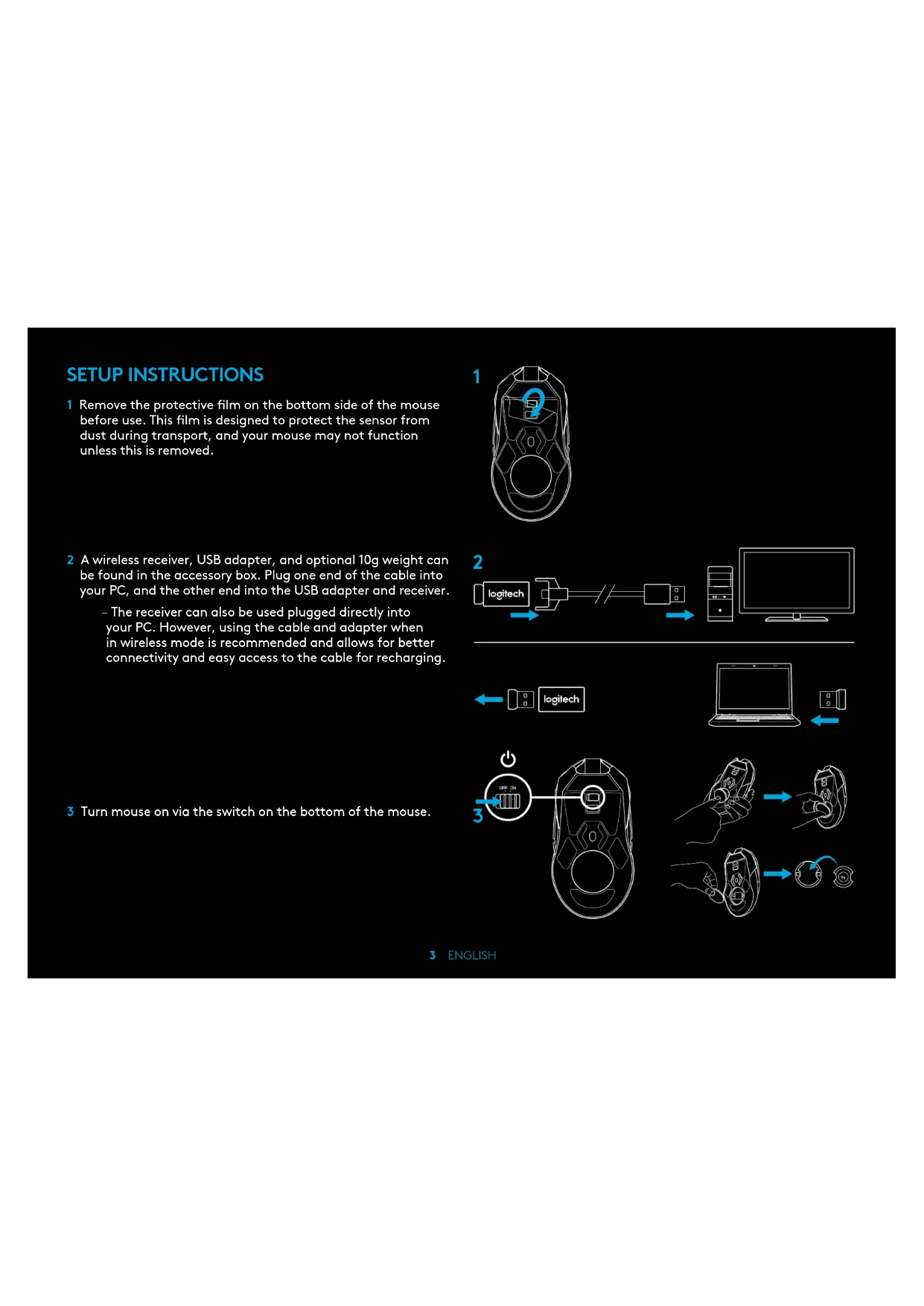 SETUP INSTRUCTIONS 1 Remove the protective lm on the bottom side of the mouse before use. This lm is designed to protect the sensor from dust during transport, and your mouse may not function unless this is removed. 2 A wireless receiver, USB adapter, and optional 10g weight can be found in theaccessory box. Plug one end of the cable into your PC, andtheother end into the USB adapter and receiver. – The receiver can also be used plugged directly into yourPC. However, using the cable and adapter when in wireless mode is recommended and allows for better connectivity and easy access to the cable for recharging. 3 Turn mouse on via the switch on the bottom of the mouse.