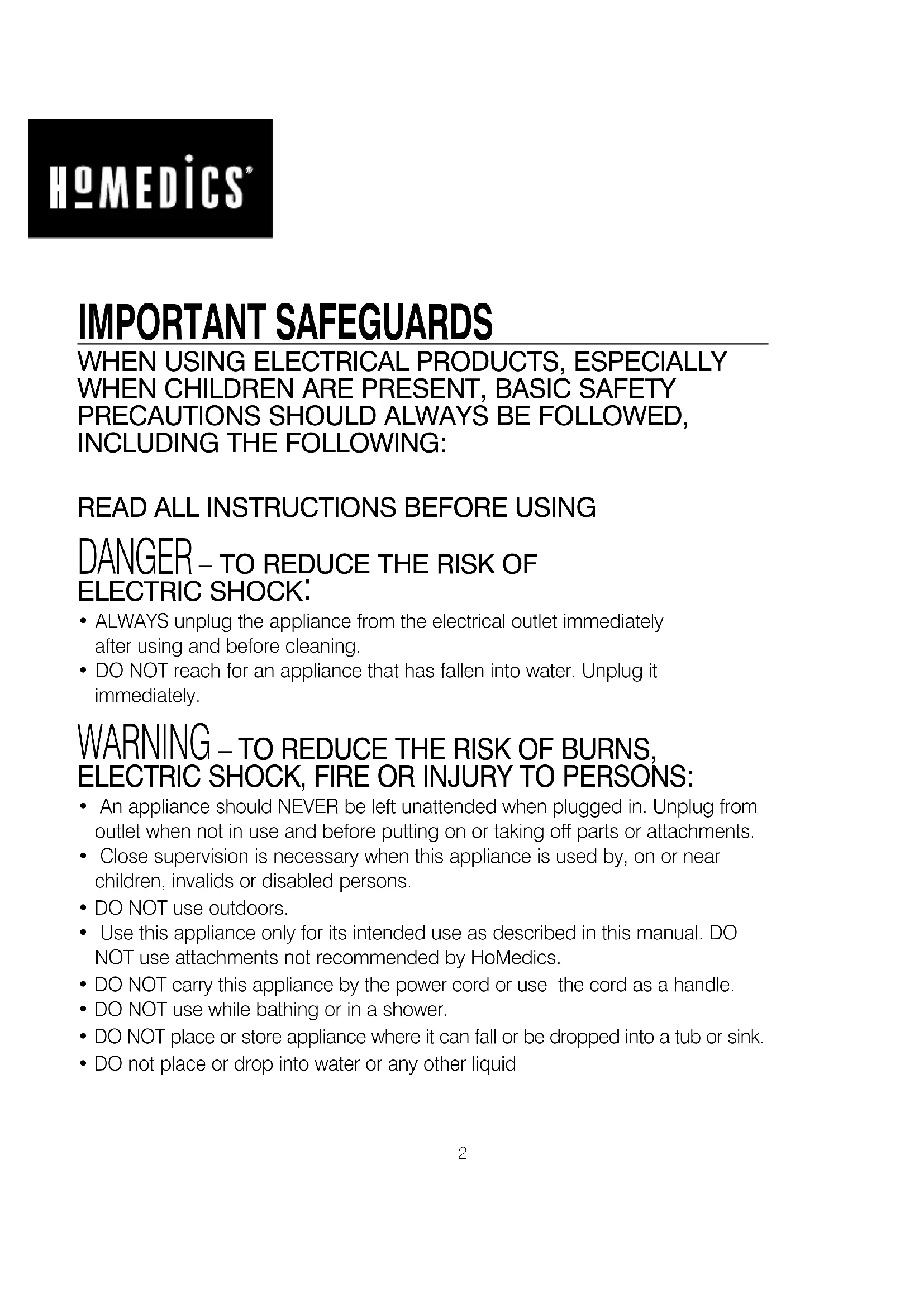 - Use this appliance only for its intended use as described in this manual. DO NOT use attachments not recommended by HoMedics.
