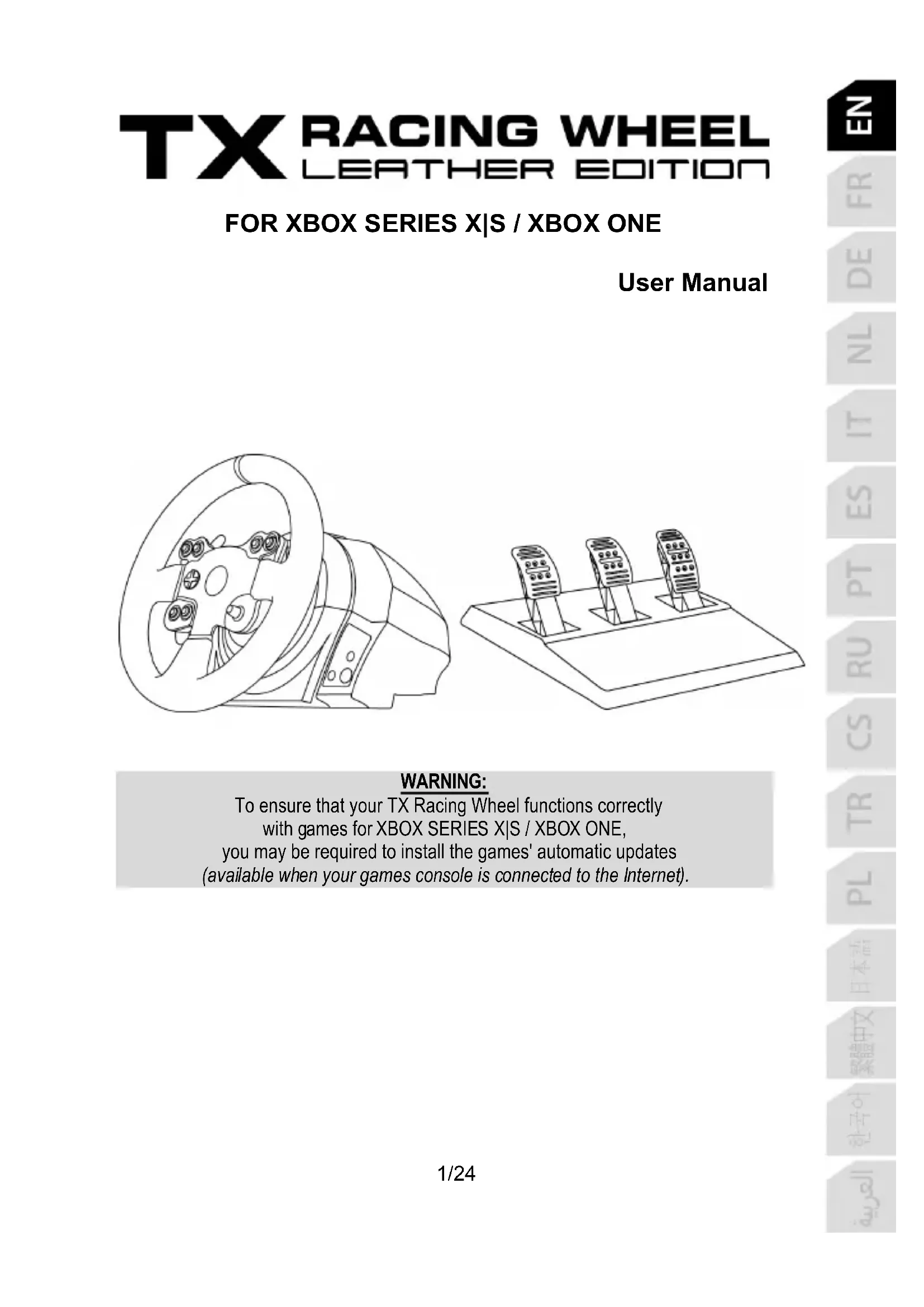 To ensure that your TX Racing Wheel functions correctly with games for XBOX SERIES X|S / XBOX ONE, you may be required to install the games' automatic updates (available when your games console is connected to the Internet).2/24 TECHNICAL SPECIFICATIONS 1 Racing wheel base 2 Racing wheel 3 2 sequential gear shift levers (Up & Down) 4 Multidirectional D-Pad 5 Switch (3 positions) 6 MODE button + Red/Green indicator light 7 Xbox Guide button 8 White indicator light 9 Large threaded hole (for attachment system and tightening screw) 10 Attachment system 11 Metal fastening screw