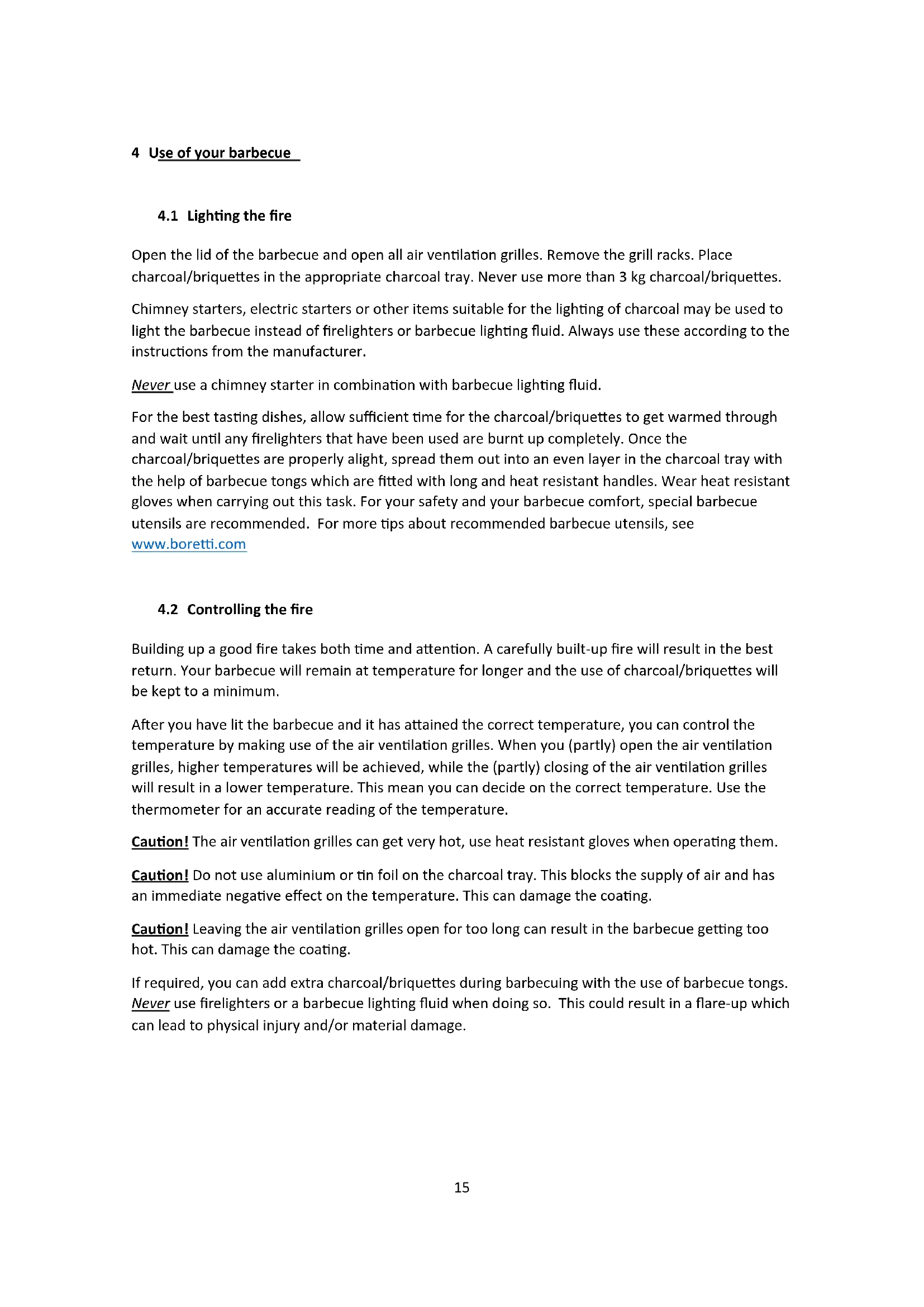 Open the lid of the barbecue and open all air ventilation grilles. Remove the grill racks. Place charcoal/briquettes in the appropriate charcoal tray. Never use more than 3 kg charcoal/briquettes. Chimney starters, electric starters or other items suitable for the lighting of charcoal may be used to light the barbecue instead of firelighters or barbecue lighting fluid. Always use these according to the instructions from the manufacturer. Never use a chimney starter in combination with barbecue lighting fluid. For the best tasting dishes, allow sufficient time for the charcoal/briquettes to get warmed through and wait until any firelighters that have been used are burnt up completely. Once the charcoal/briquettes are properly alight, spread them out into an even layer in the charcoal tray with the help of barbecue tongs which are fitted with long and heat resistant handles. Wear heat resistant gloves when carrying out this task. For your safety and your barbecue comfort, special barbecue utensils are recommended. For more tips about recommended barbecue utensils, see www.boretti.com