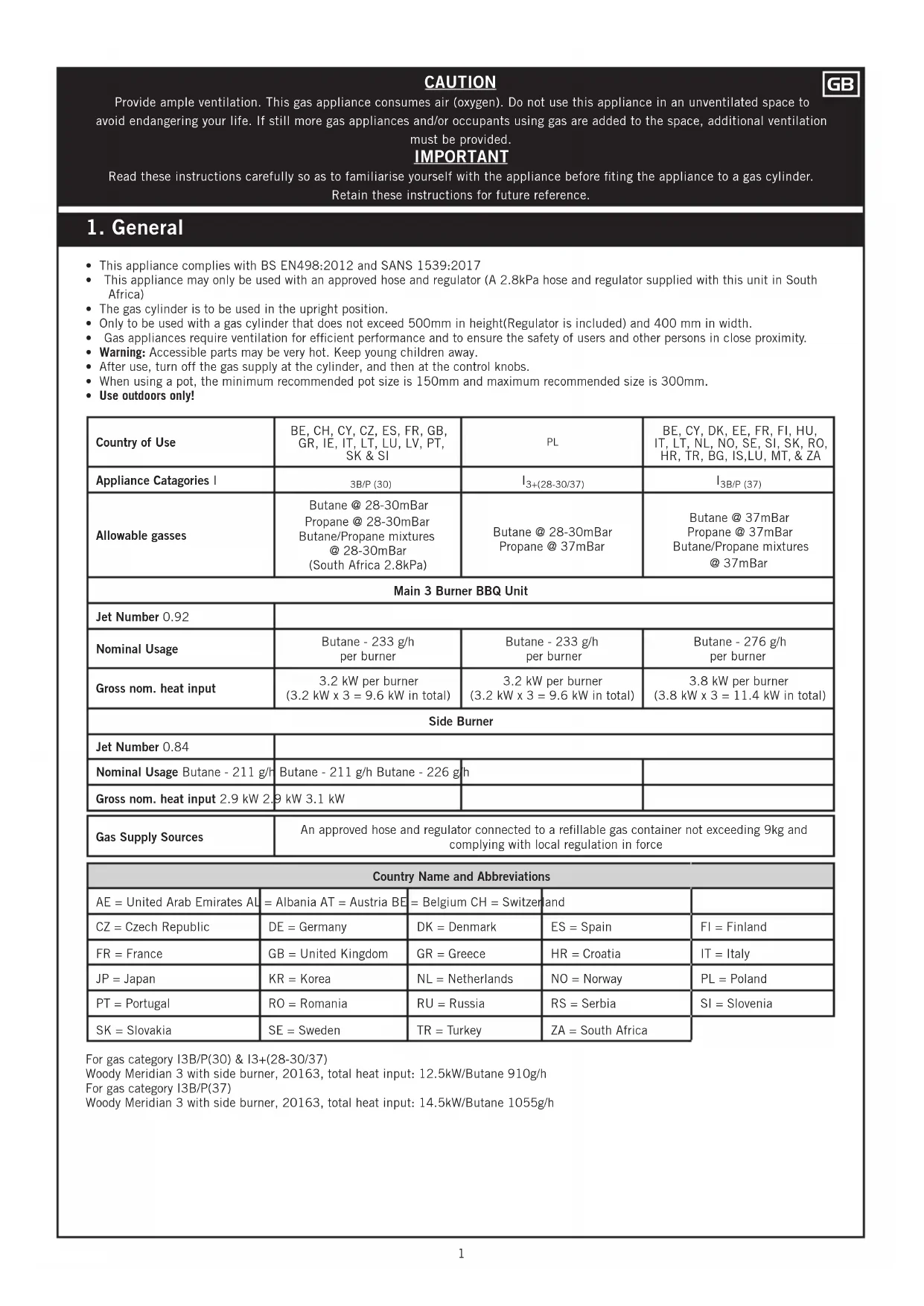 (3.8 kW x 3 = 11.4 kW in total) Side Burner Jet Number 0.84 Nominal Usage Butane - 211 g/h Butane - 211 g/h Butane - 226 g/h Gross nom. heat input 2.9 kW 2.9 kW 3.1 kW Country Name and Abbreviations AE = United Arab Emirates AL = Albania AT = Austria BE = Belgium CH = Switzerland CZ = Czech Republic DE = Germany DK = Denmark ES = Spain FI = Finland FR = France GB = United Kingdom GR = Greece HR = Croatia IT = Italy JP = Japan KR = Korea NL = Netherlands NO = Norway PL = Poland PT = Portugal RO = Romania RU = Russia RS = Serbia SI = Slovenia SK = Slovakia SE = Sweden TR = Turkey ZA = South Africa For gas category I3B/P(30) & I3+(28-30/37) Woody Meridian 3 with side burner, 20163, total heat input: 12.5kW/Butane 910g/h For gas category I3B/P(37) Woody Meridian 3 with side burner, 20163, total heat input: 14.5kW/Butane 1055g/h22