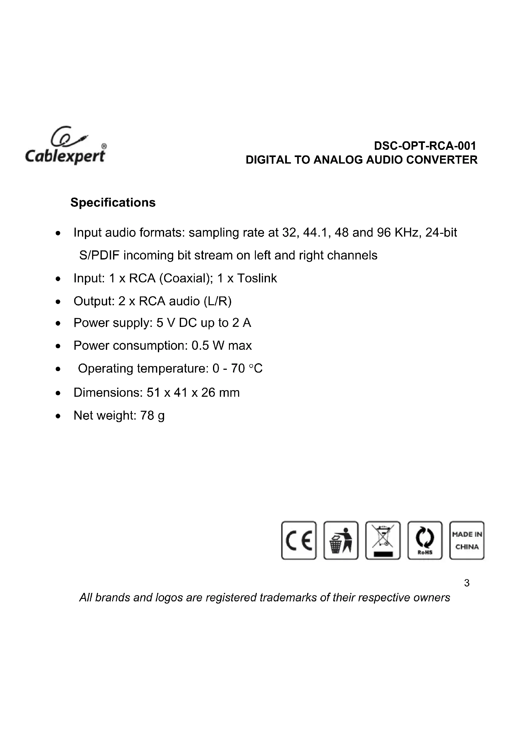 All brands and logos are registered trademarks of their respective owners Specifications Input audio formats: sampling rate at 32, 44.1, 48 and 96 KHz, 24-bit S/PDIF incoming bit stream on left and right channels Input: 1 x RCA (Coaxial); 1 x Toslink Output: 2 x RCA audio (L/R) Power supply: 5 V DC up to 2 A Power consumption: 0.5 W max Operating temperature: 0 - 70 С Dimensions: 51 x 41 x 26 mm Net weight: 78 g4 DSC-OPT-RCA-001