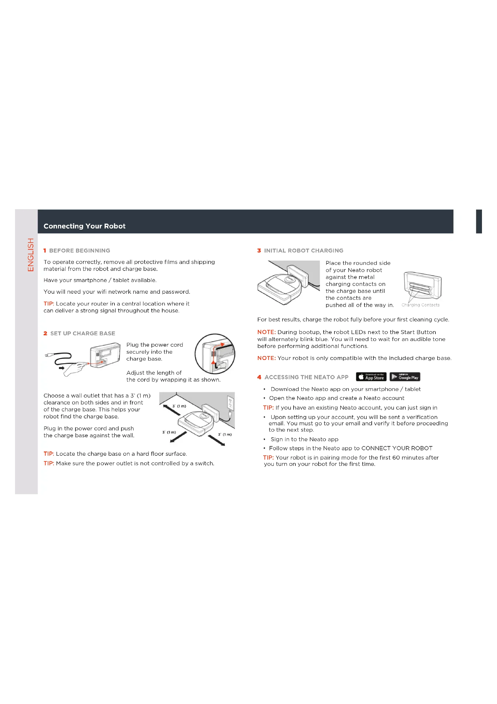 - Follow steps in the Neato app to CONNECT YOUR ROBOT TIP: Your robot is in pairing mode for the first 60 minutes after you turn on your robot for the first time. Choose a wall outlet that has a 3’ (1 m) clearance on both sides and in front of the charge base. This helps your robot find the charge base. Plug in the power cord and push the charge base against the wall. TIP: Locate the charge base on a hard floor surface. TIP: Make sure the power outlet is not controlled by a switch. Charging Contacts Connecting Your Robot ENGLISHIf you are not able to connect your robot, you may need to restart the pairing mode. Follow these steps: