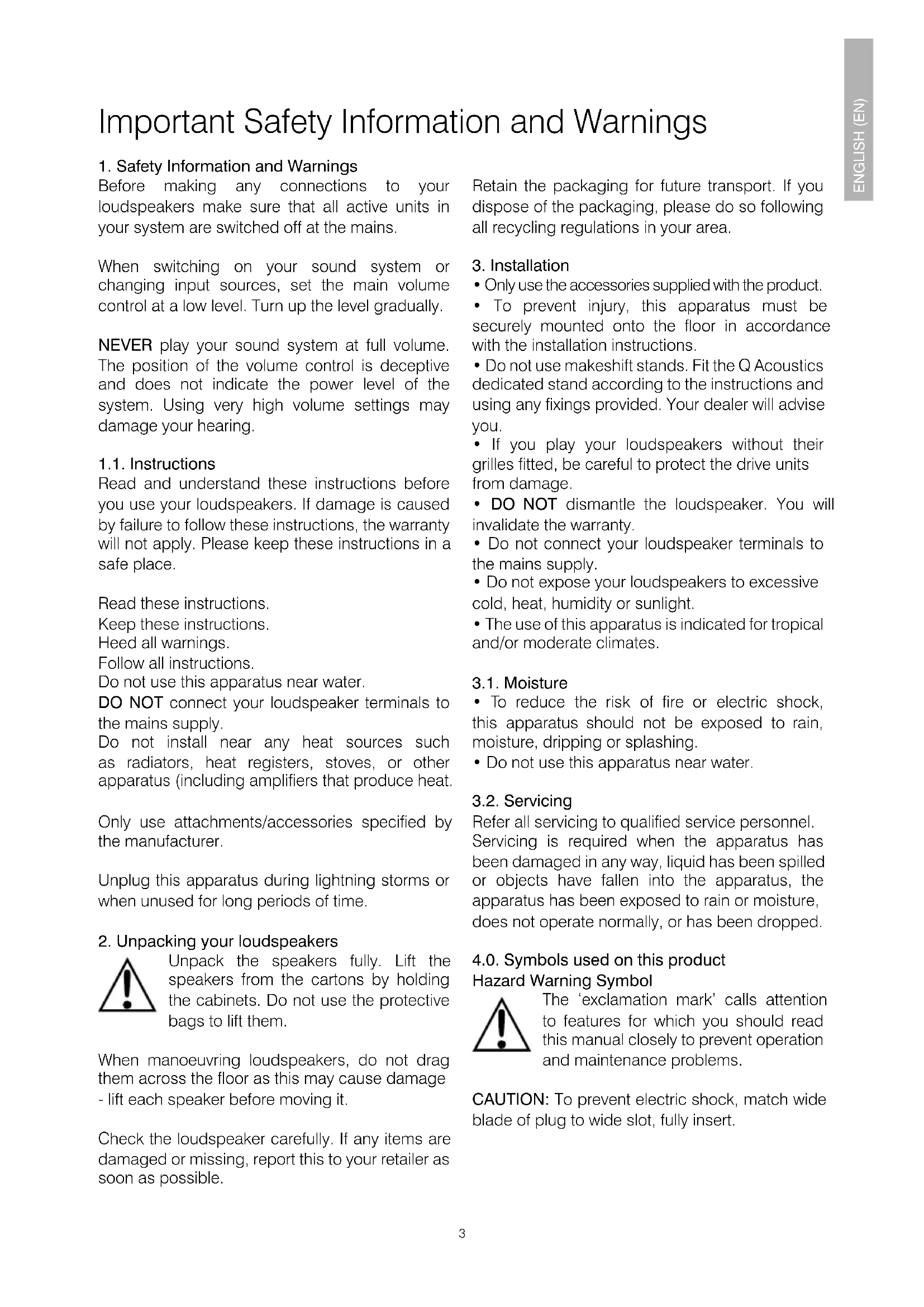 Before making any connections to your loudspeakers make sure that all active units in your system are switched off at the mains. When switching on your sound system or changing input sources, set the main volume control at a low level. Turn up the level gradually. NEVER play your sound system at full volume. The position of the volume control is deceptive and does not indicate the power level of the system. Using very high volume settings may damage your hearing. 1.1. Instructions Read and understand these instructions before you use your loudspeakers. If damage is caused by failure to follow these instructions, the warranty will not apply. Please keep these instructions in a safe place. Read these instructions. Keep these instructions. Heed all warnings. Follow all instructions. Do not use this apparatus near water. DO NOT connect your loudspeaker terminals to the mains supply. Do not install near any heat sources such as radiators, heat registers, stoves, or other apparatus (including ampliers that produce heat. Only use attachments/accessories specied by the manufacturer. Unplug this apparatus during lightning storms or when unused for long periods of time.